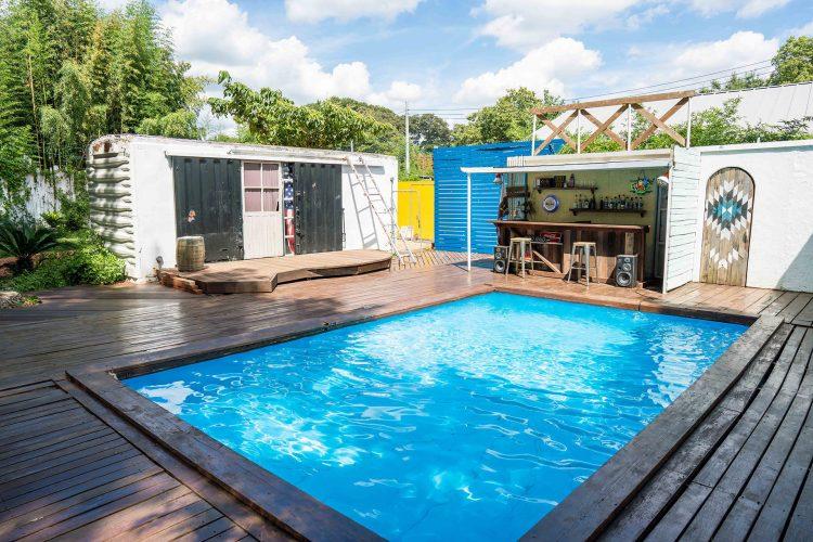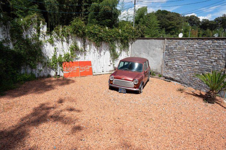 広々とした250坪の森の中で、広い芝生、プライベートプール、古いキャンピングカー、ガレージハウスなどを揃えました。