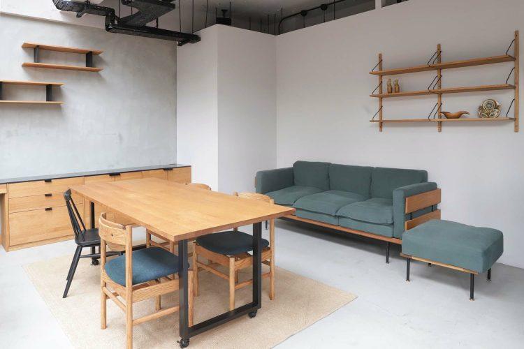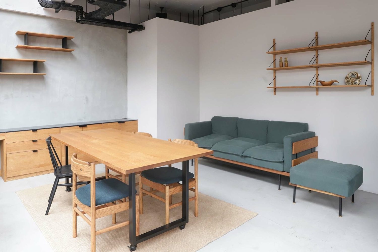 インテリアブランドのショールームとしても兼ねている空間は、キャスター付きで移動可能なオーダーキッチンなどの設備や、スタジオに備え付けの家具、食器、雑貨など自由にご利用いただけます。