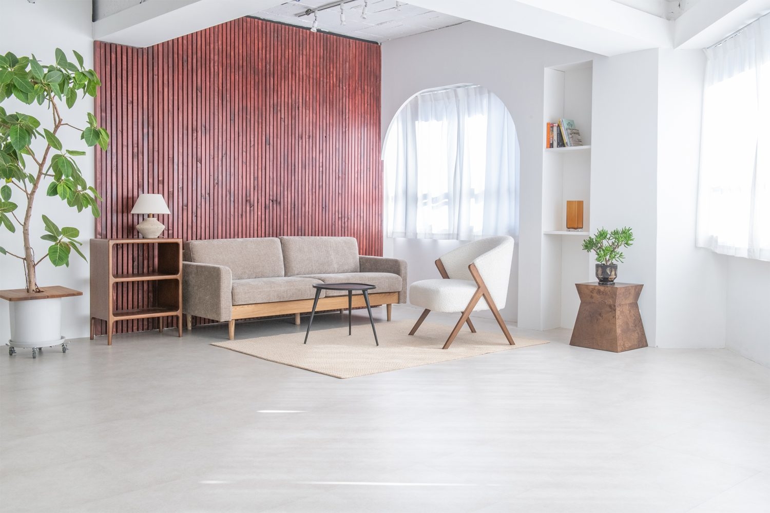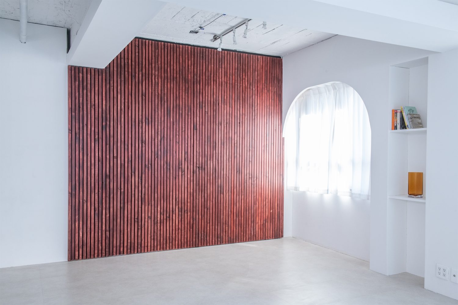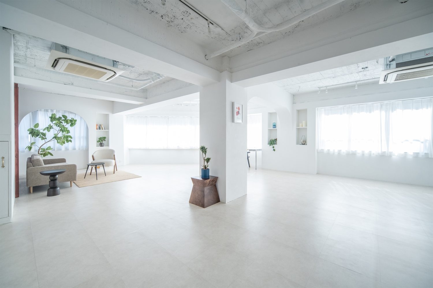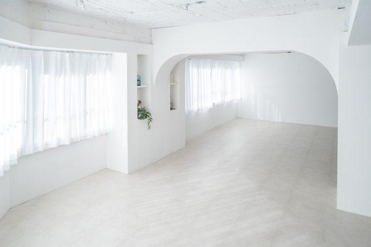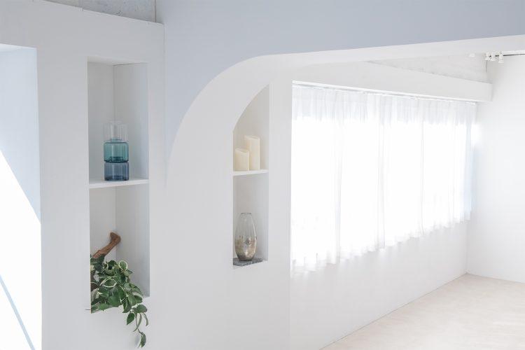 新宿御苑駅から徒歩5分、四谷三丁目駅からも徒歩圏内という好立地の撮影スタジオです。白を基調としたシンプルな内装でありながら、特徴的な五角形の空間形状がニュアンスを添えています。柱の一部がアーチ状になっており、やわらかな空気感を演出。北東側のウッド壁を背景にあたたかなイメージの撮影も叶います。