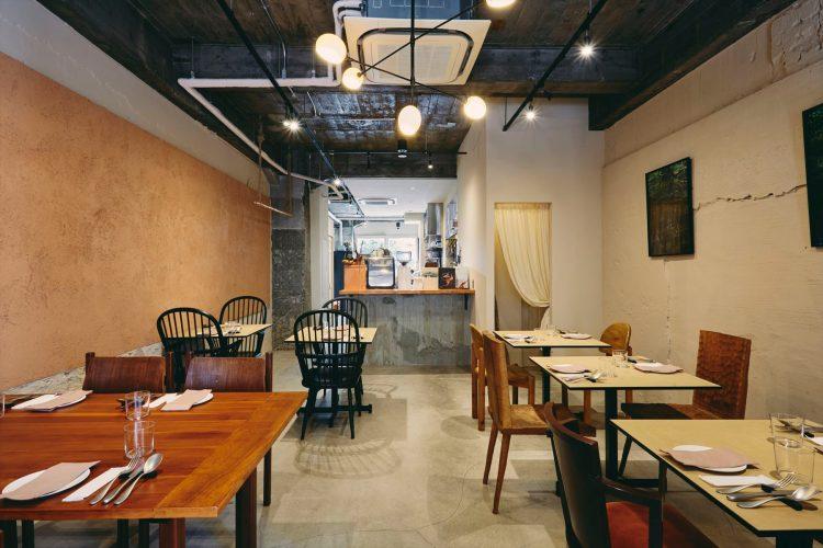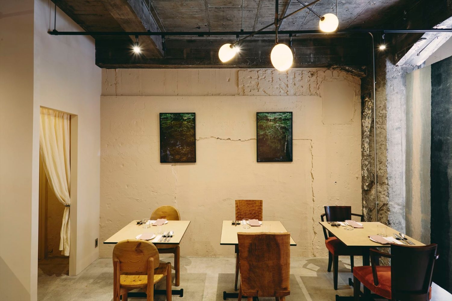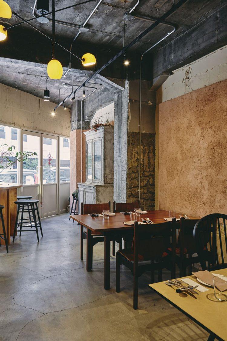 アンティークのキャビネット、アールのカウンター、オレンジの左官壁、躯体モルタルの白壁、小さなスペースに雰囲気のある背景が凝縮されています。