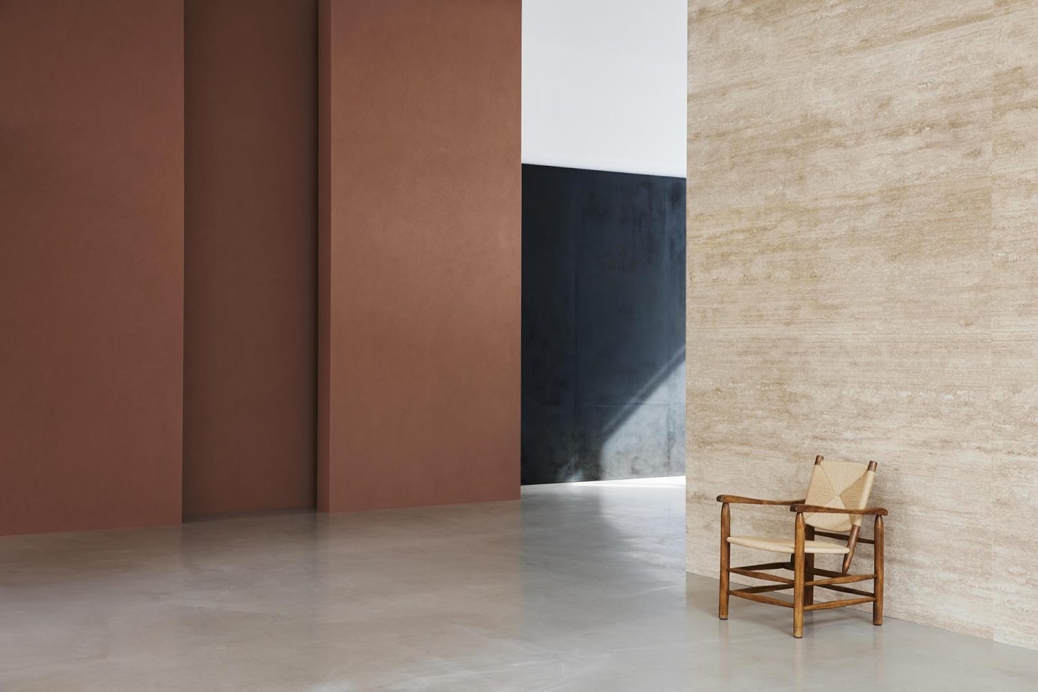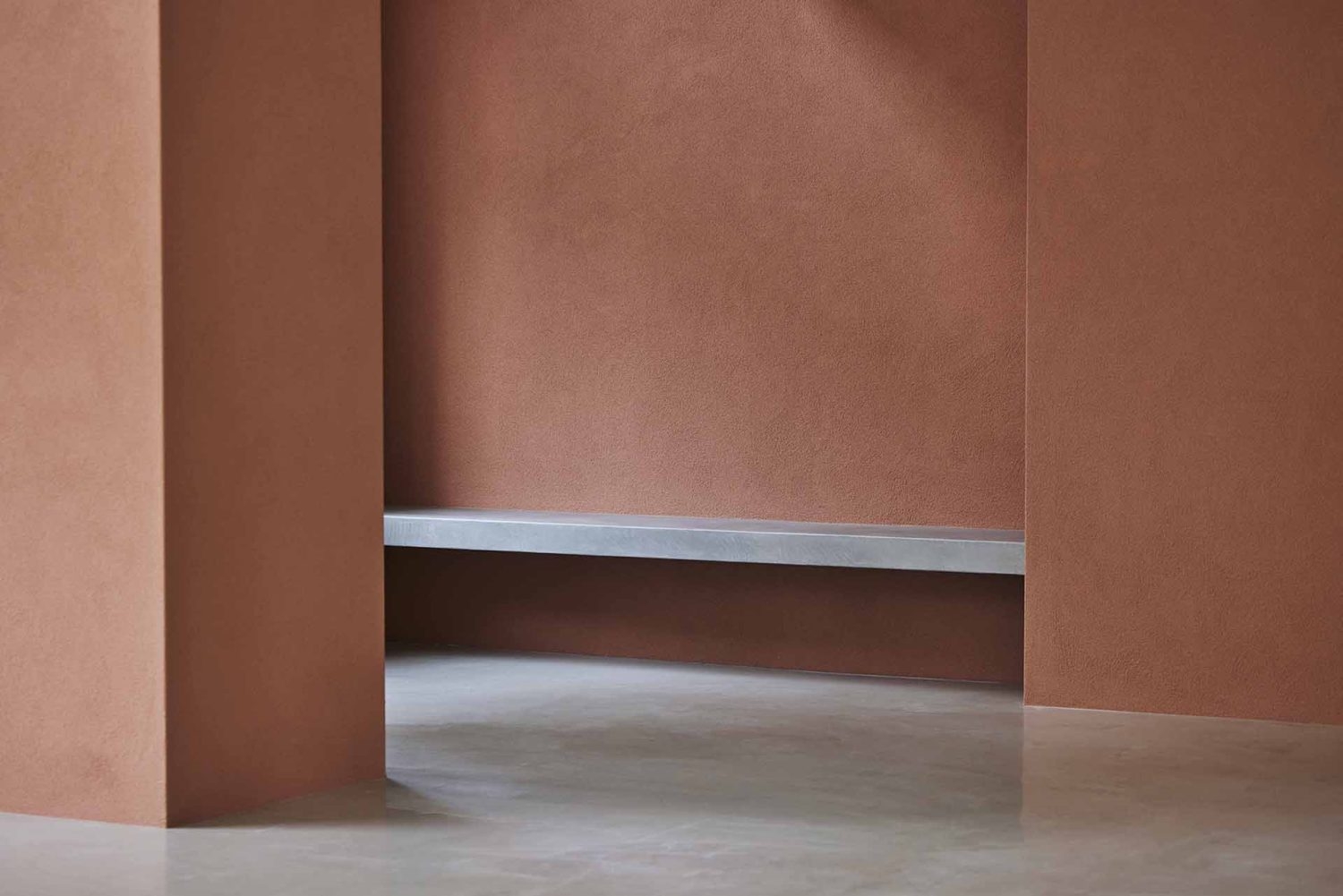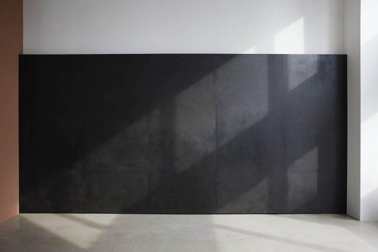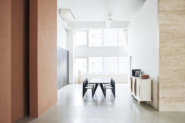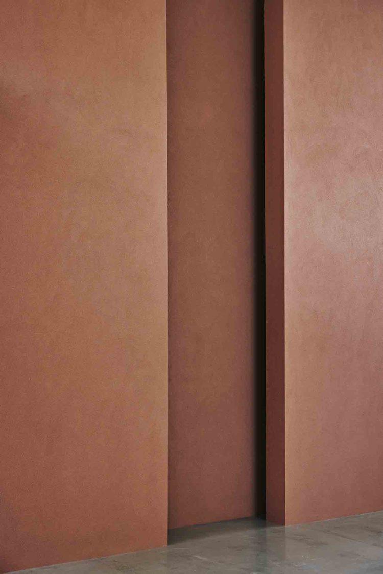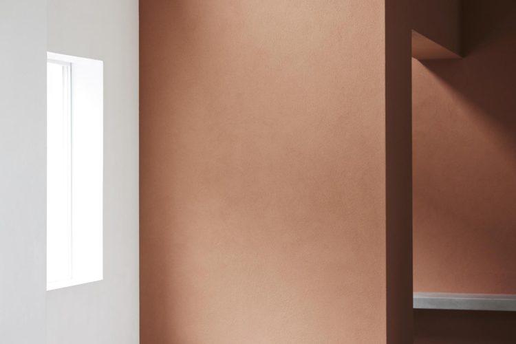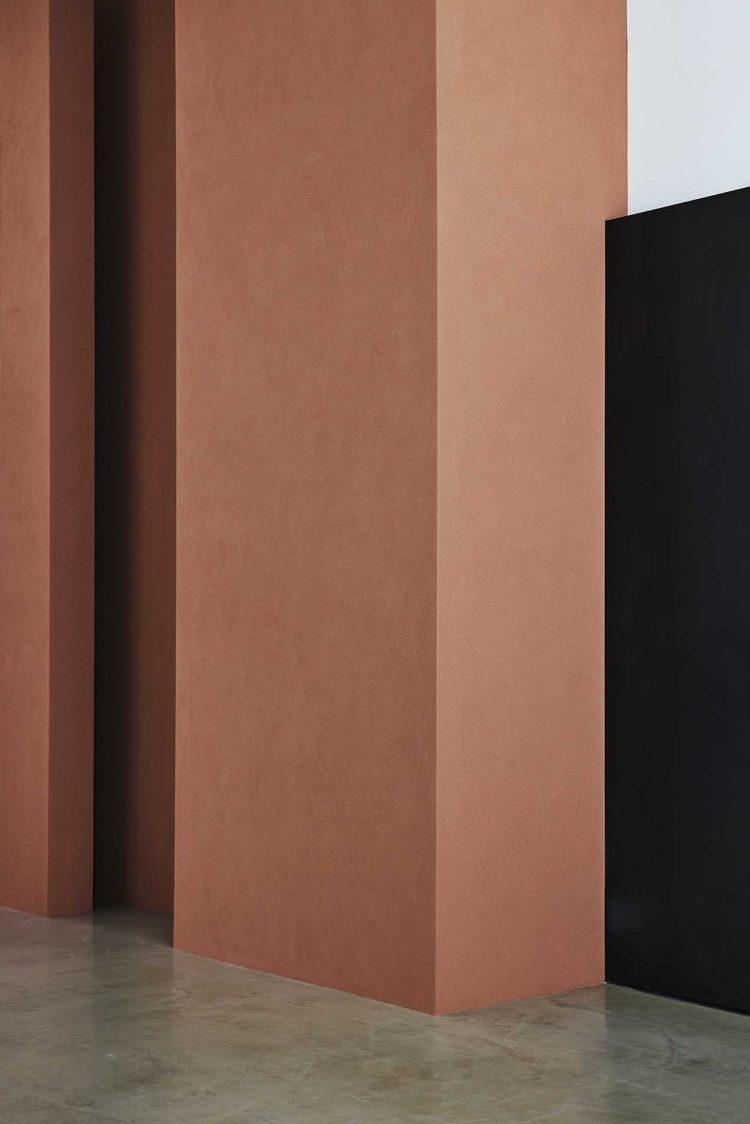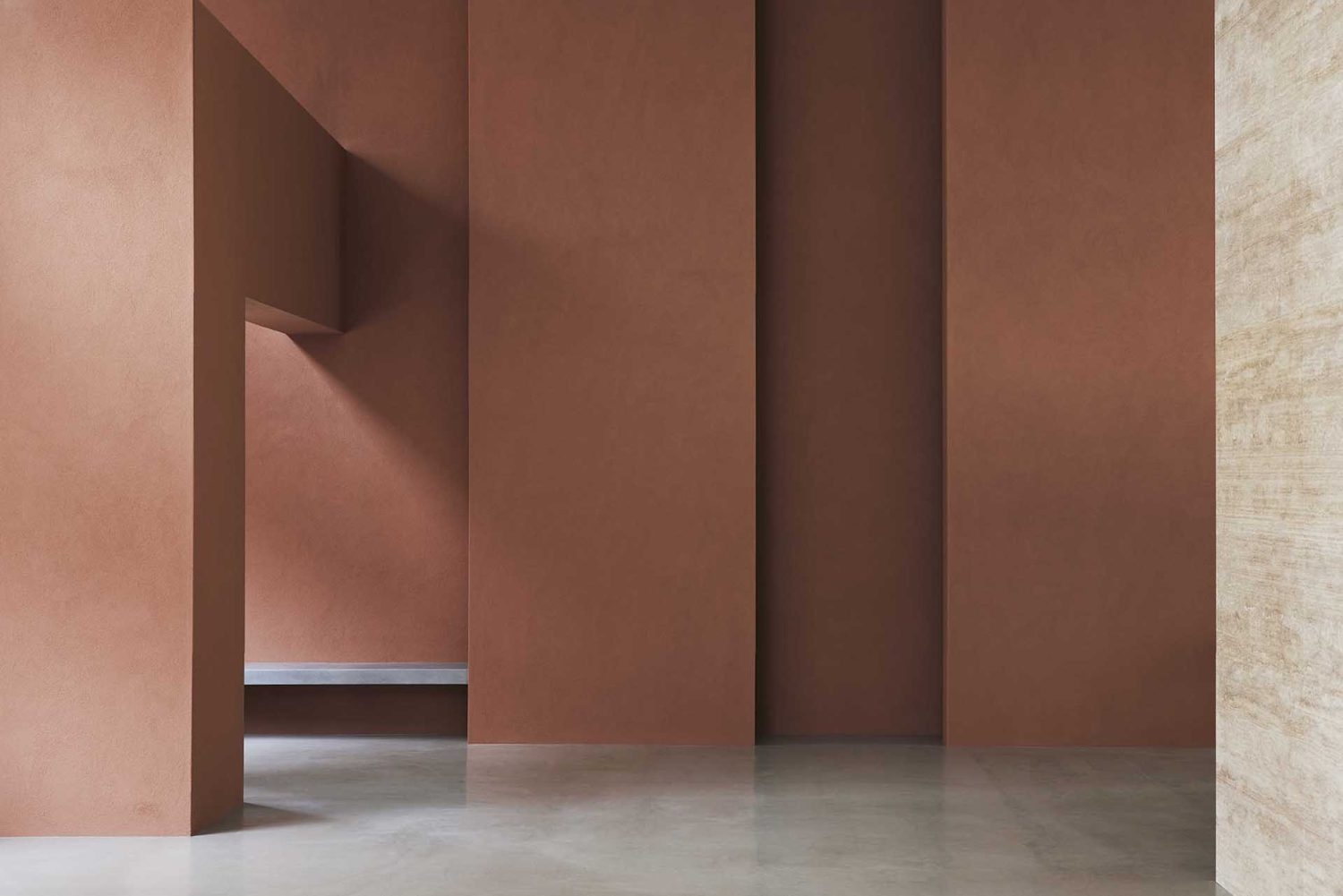 左官職人が仕上げたテラコッタカラーの立体的な壁面、優美なコントラストが印象的な大理石とチーク材の壁面、エイジングに時を費やした黒錆の壁面、柔らかな日差しが差し込むライトグレーの土壁、モダンな特大サイズの可動壁は大開口の窓際に設置することにより綺麗な日差しを捉えます。
