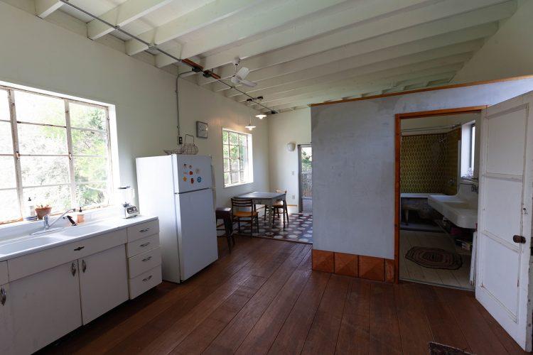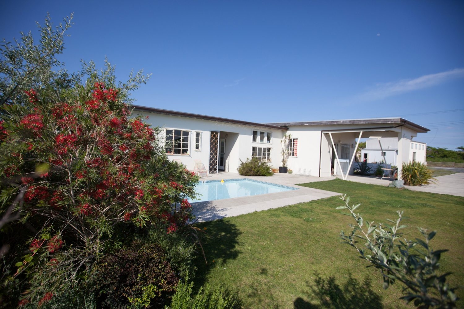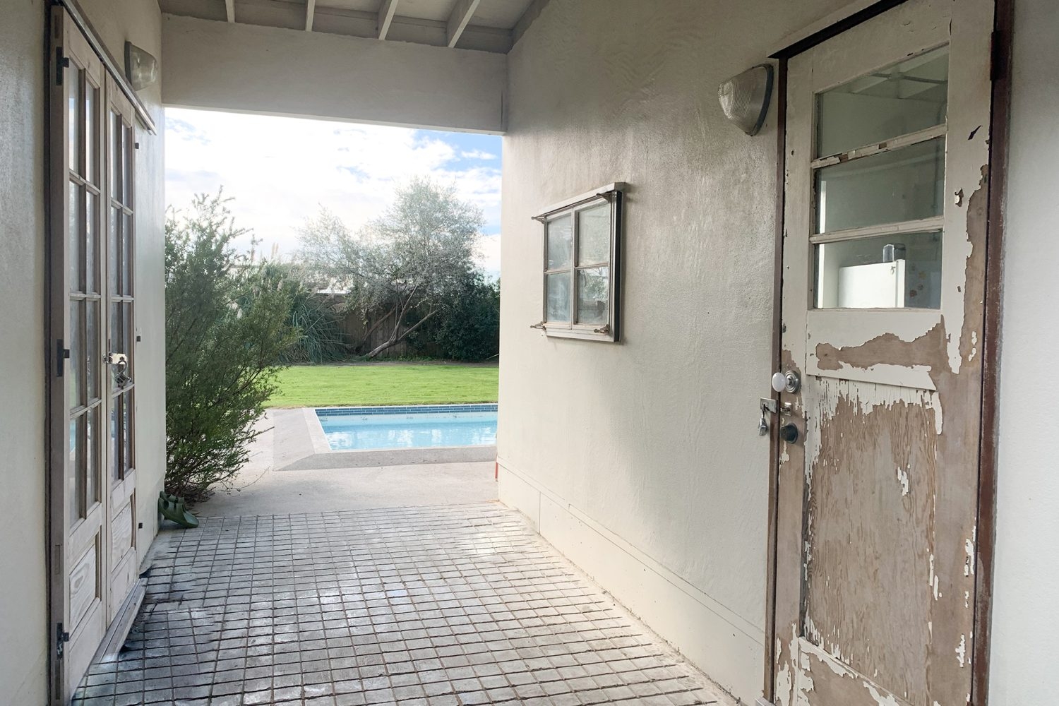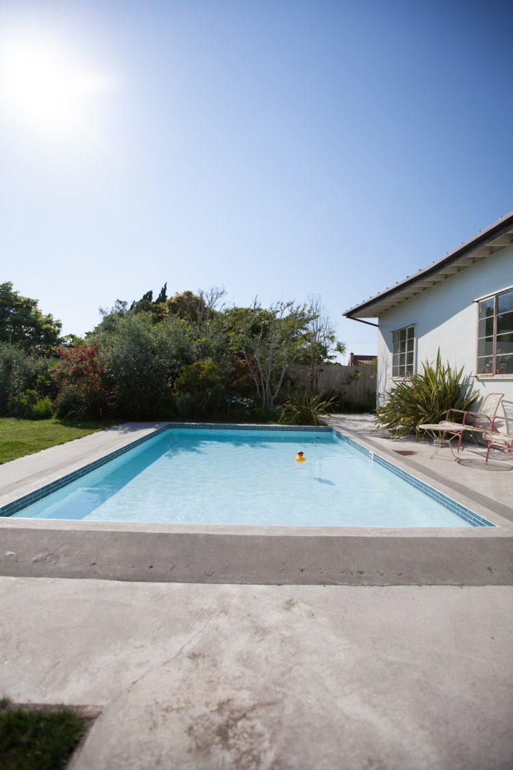 白を基調とした海外を思わせる内装とそこから見える緑豊かな広い庭には、透明感あふれるプール。撮影スタジオであることを忘れるくらいの開放感があります。
