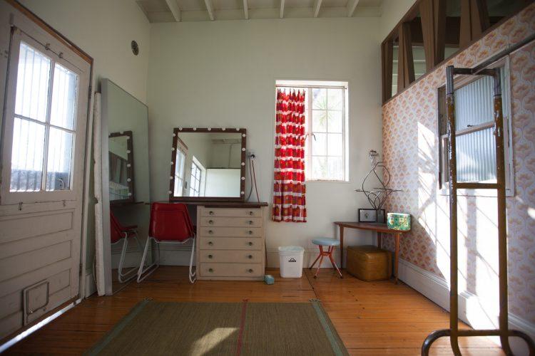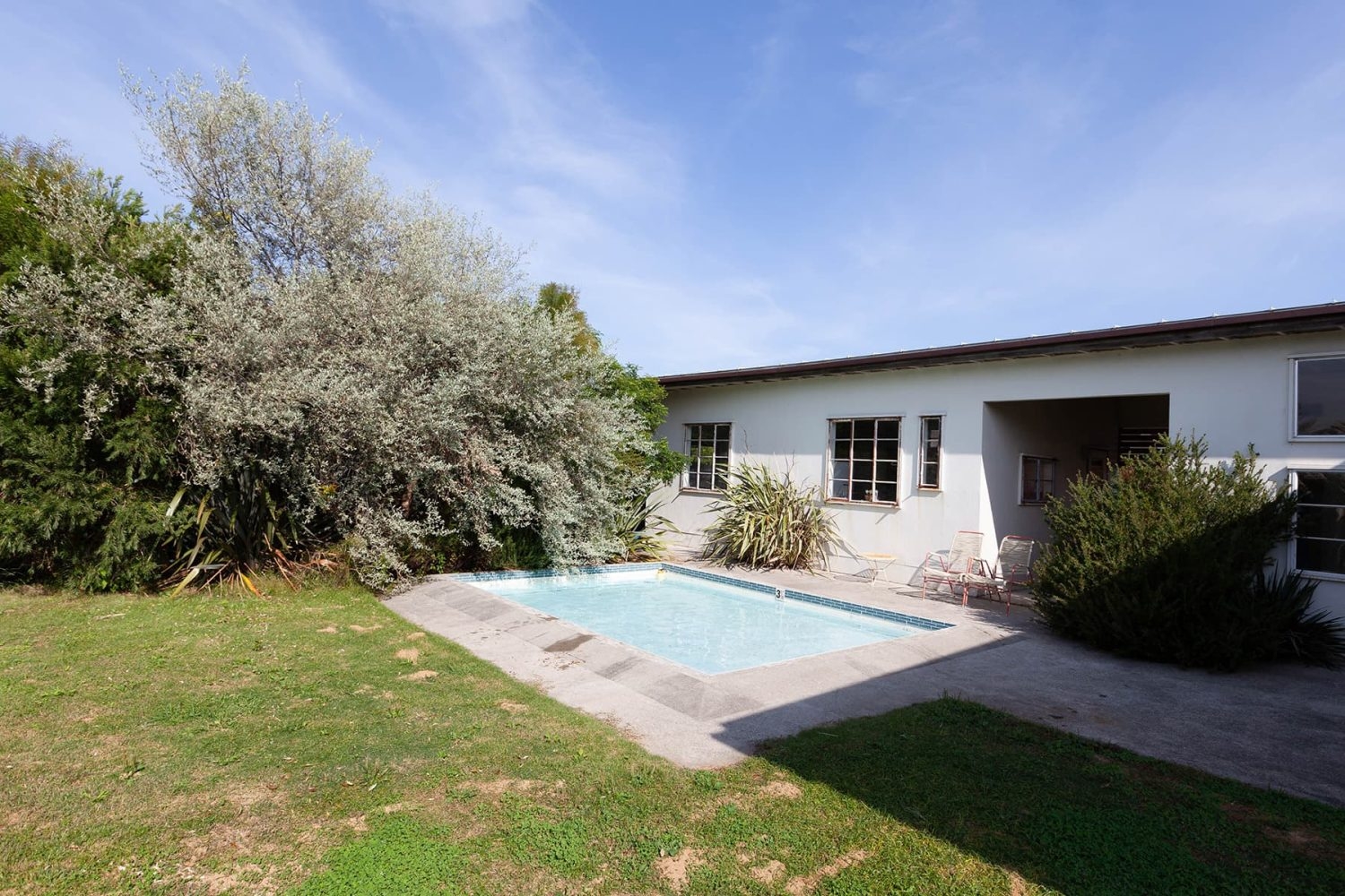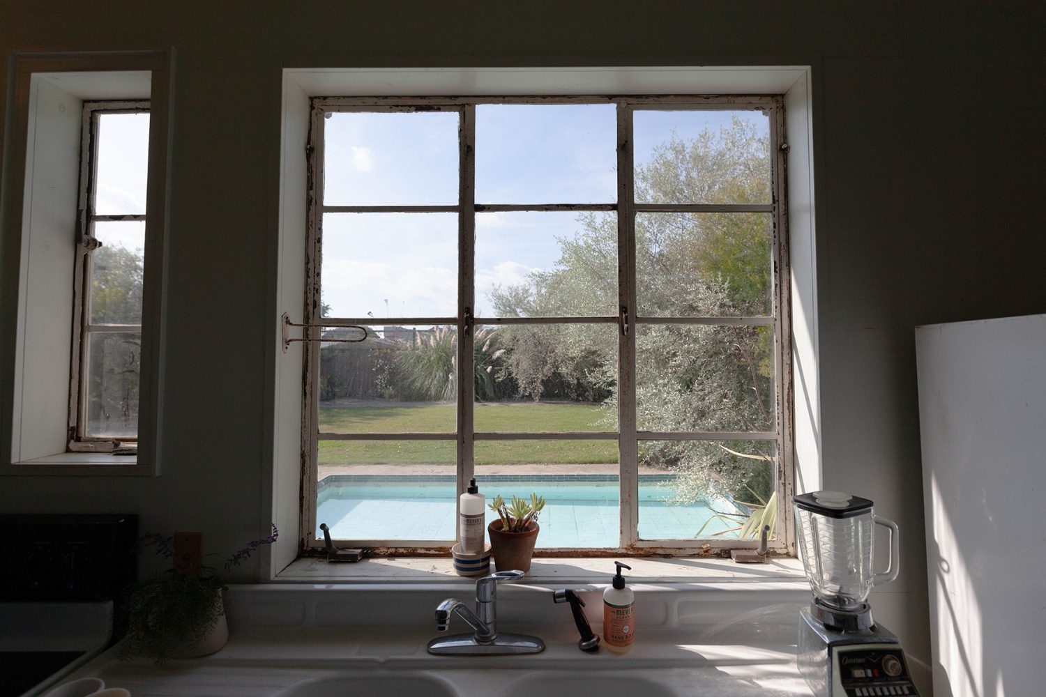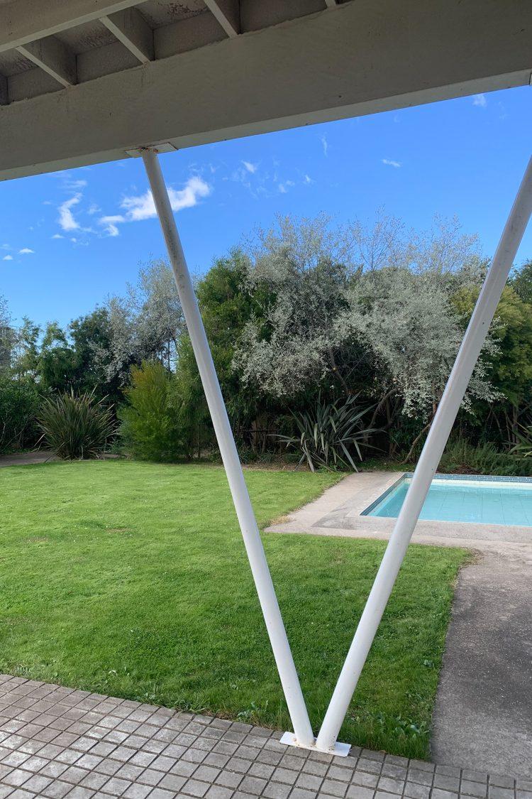 白を基調とした海外を思わせる内装とそこから見える緑豊かな広い庭には、透明感あふれるプール。撮影スタジオであることを忘れるくらいの開放感があります。