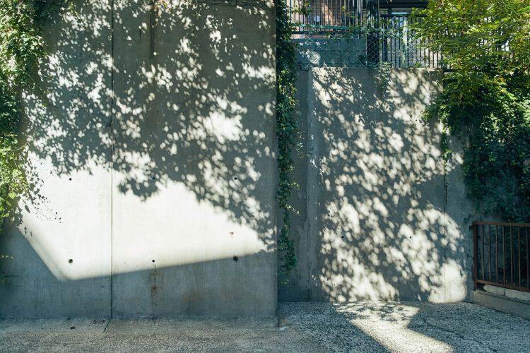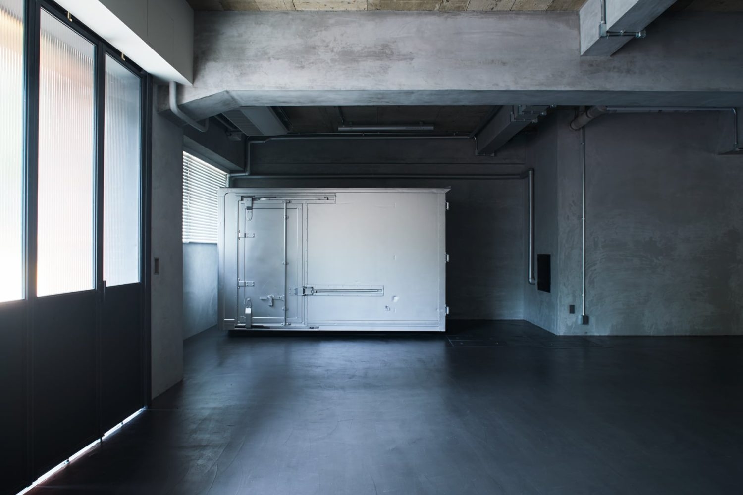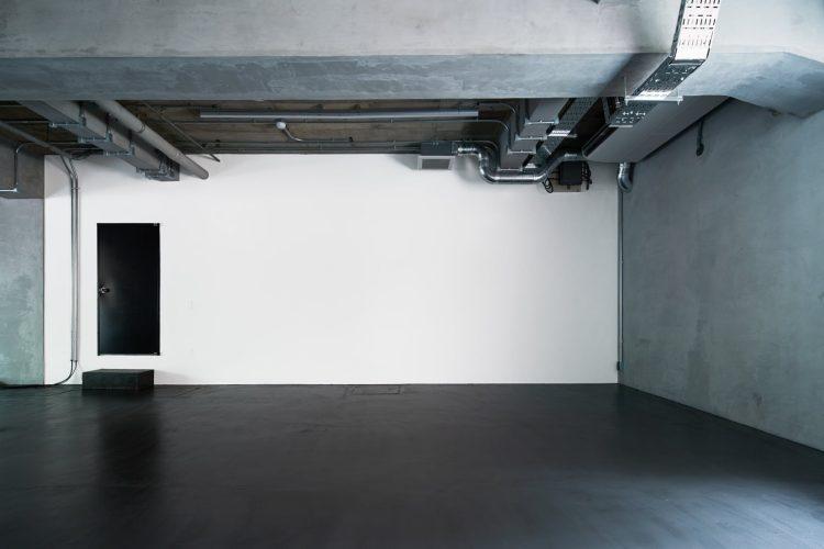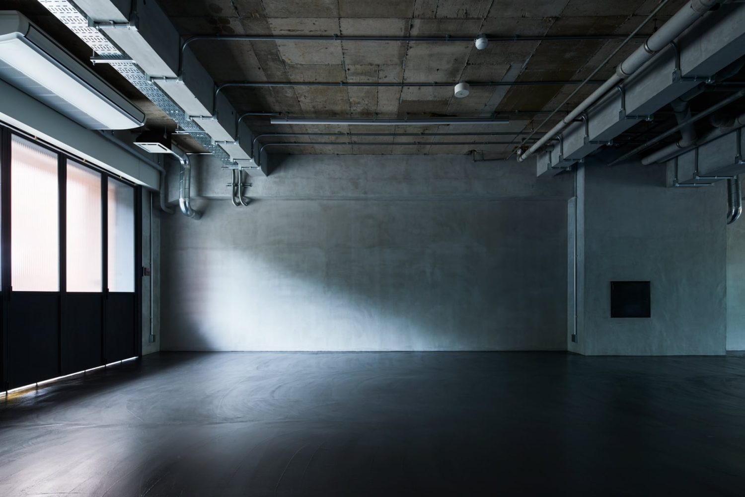 スタジオ内は、グレーのモルタル壁と白壁の2面で、床は黒モルタルで仕上げたモノトーンな空間。
