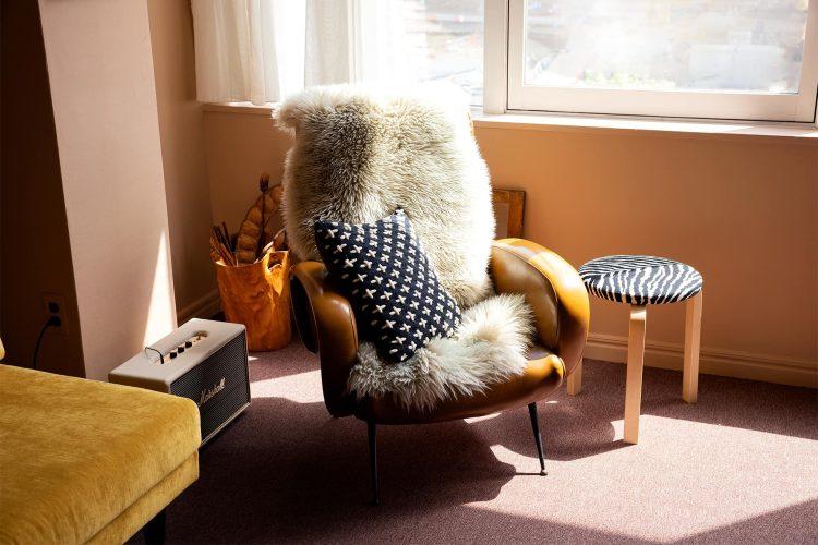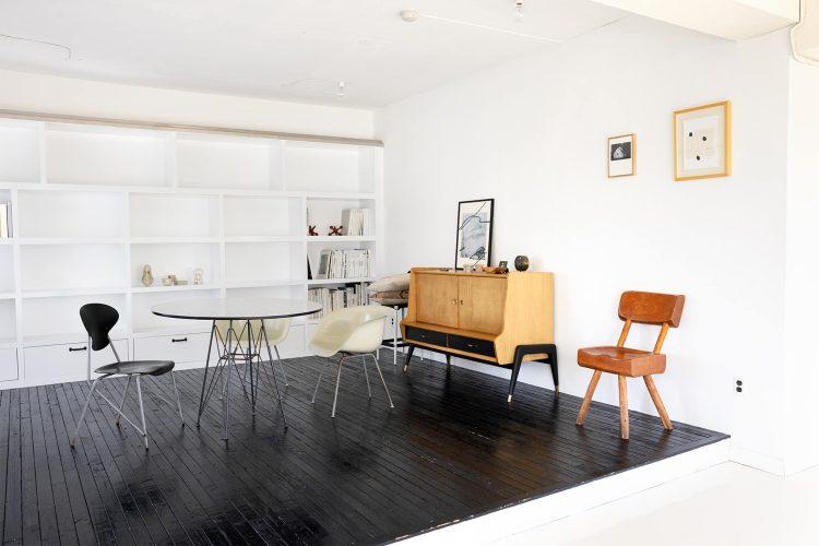 白床側はスッキリとした内装、カーペット側はさまざまな家具やプロップスを配置しています。