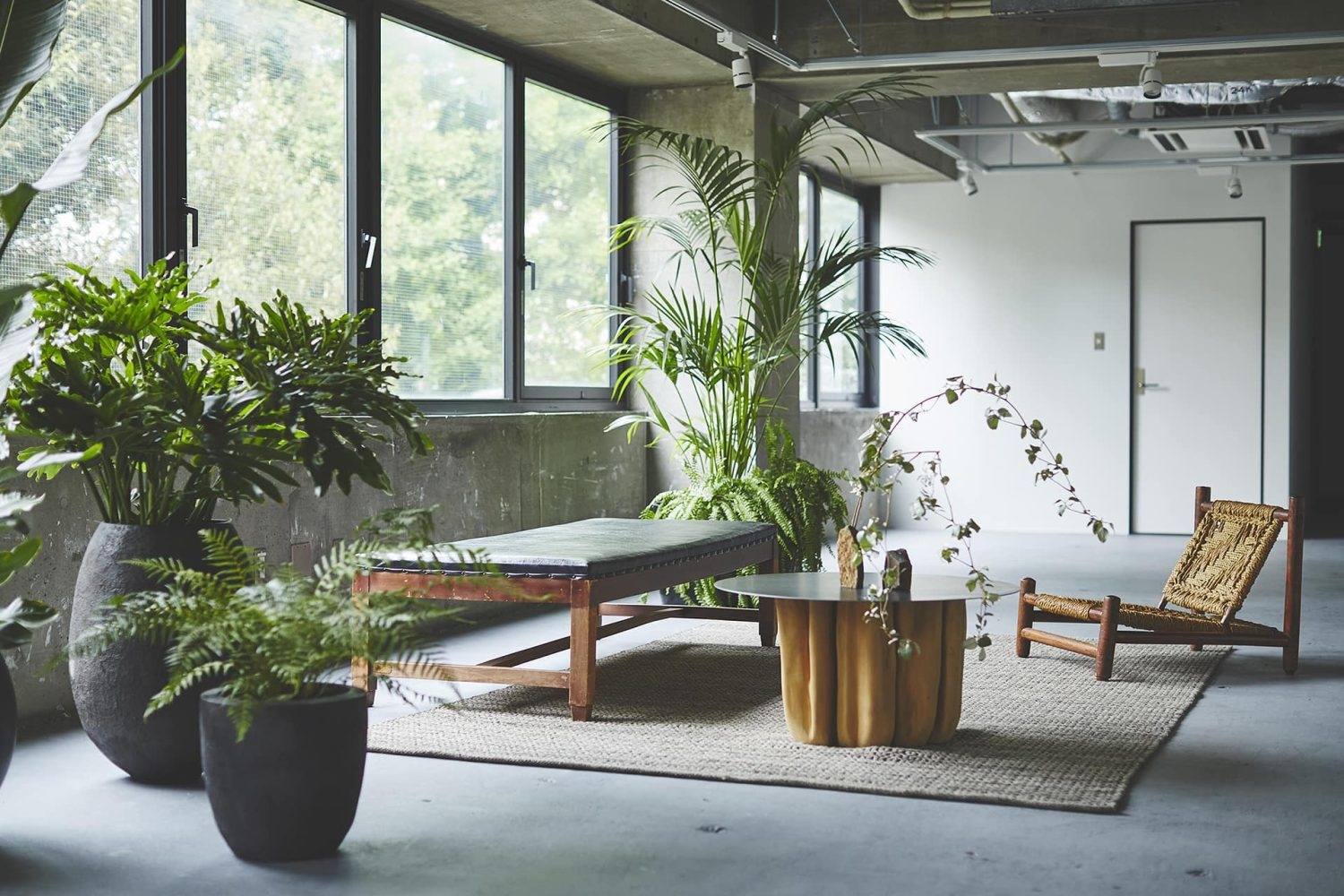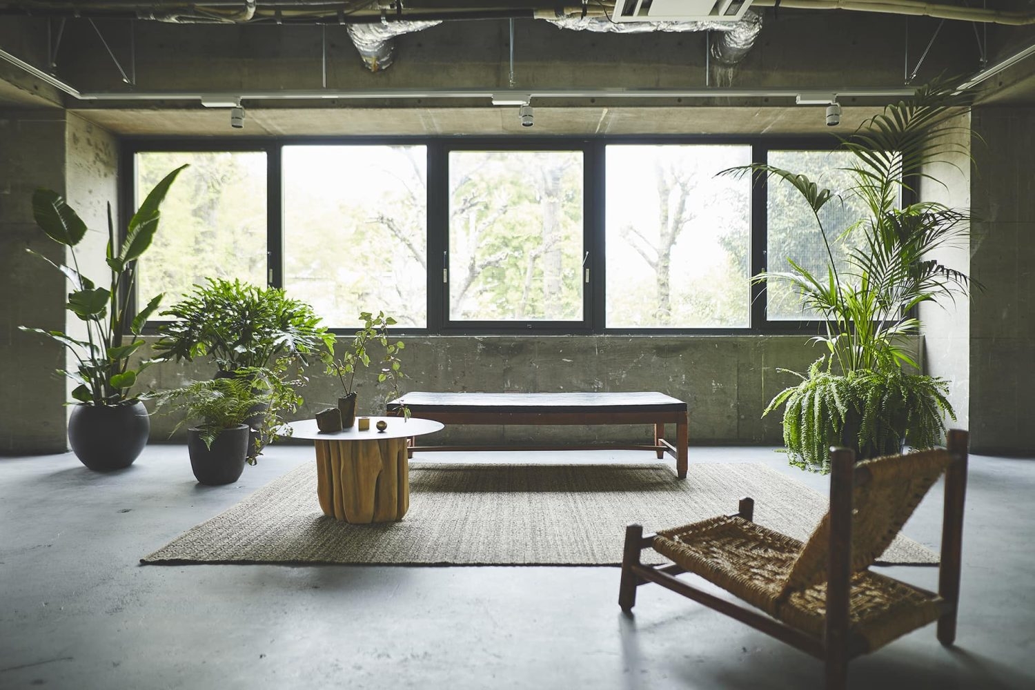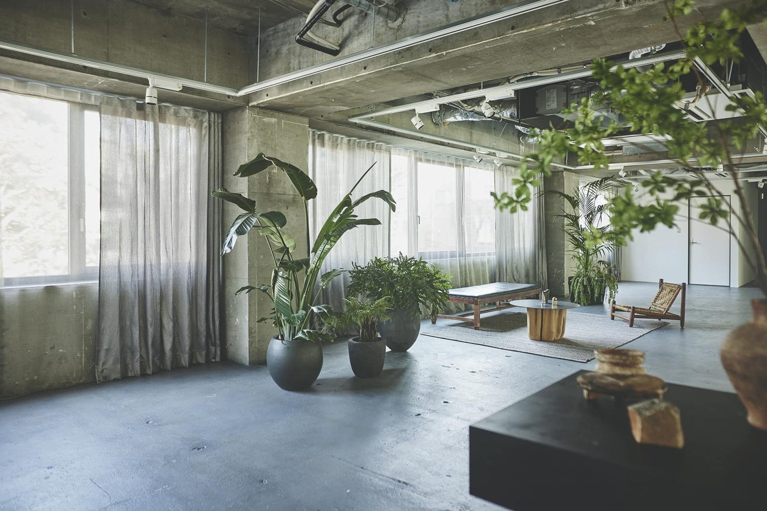 品川区鮫洲駅徒歩2分、大井町駅徒歩12分圏内の地上3階建ての2階フロア。 躯体現しのモルタル壁床で、ラスティックな質感のプロップとさまざまなサイズの植物がアクセントとなる空間です。 一棟貸し、24時間利用もご案内できますので、大掛かりな撮影や展示会なども幅広くご相談ください。