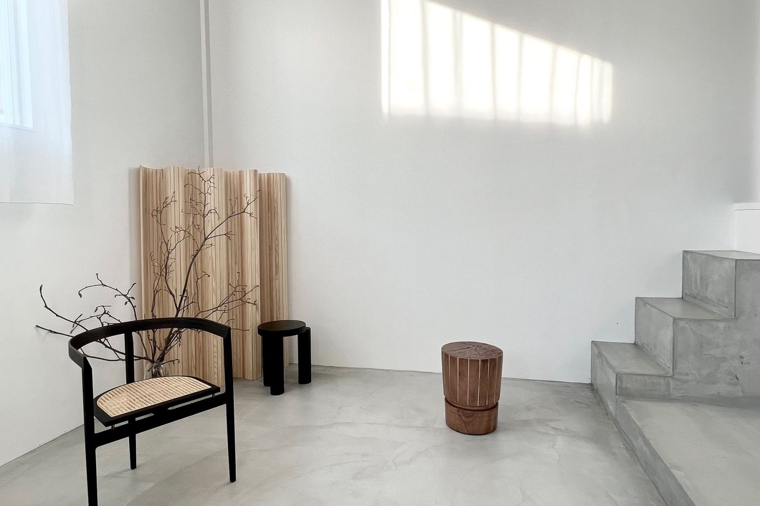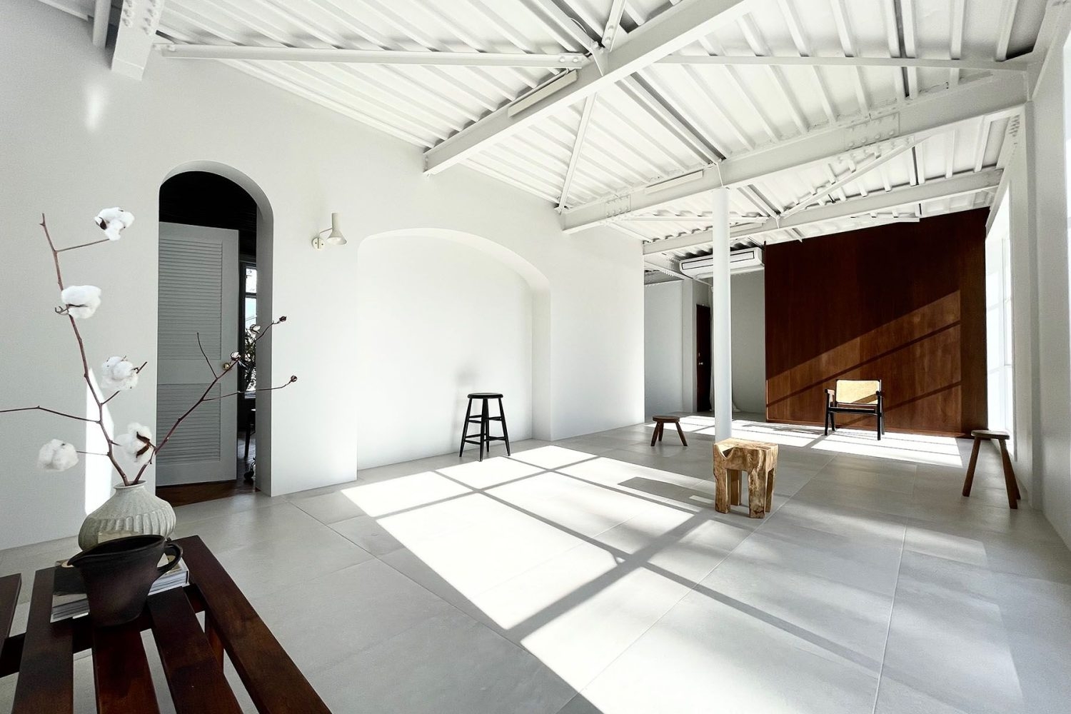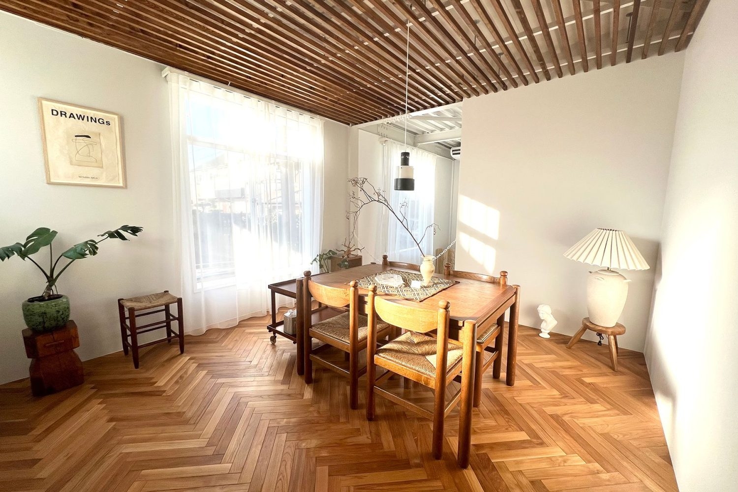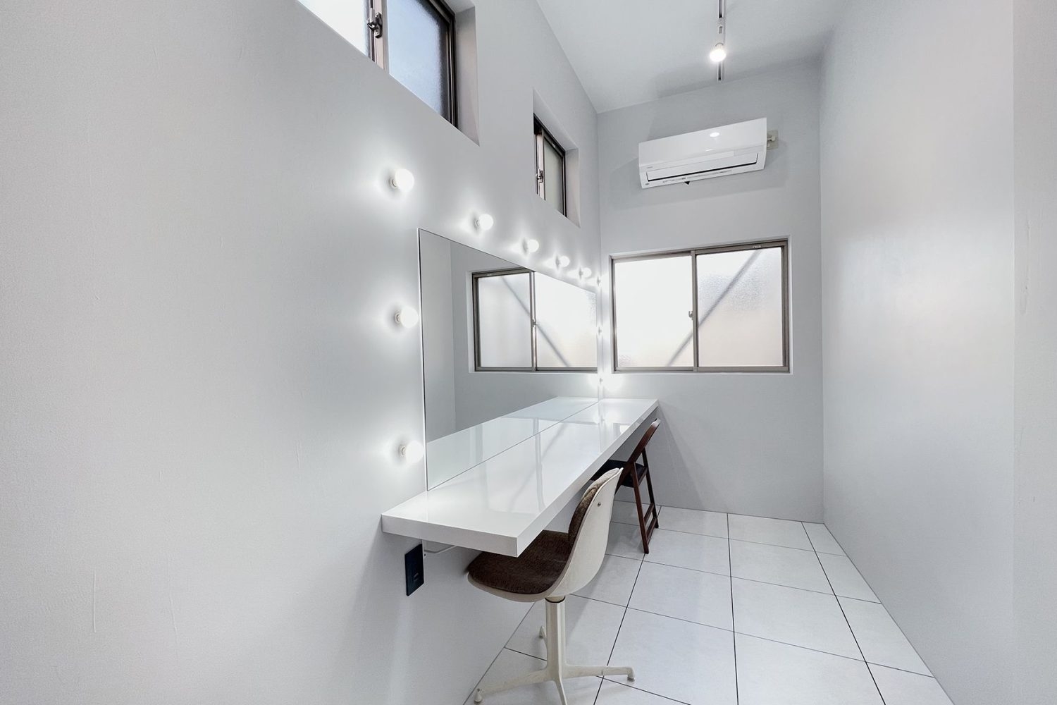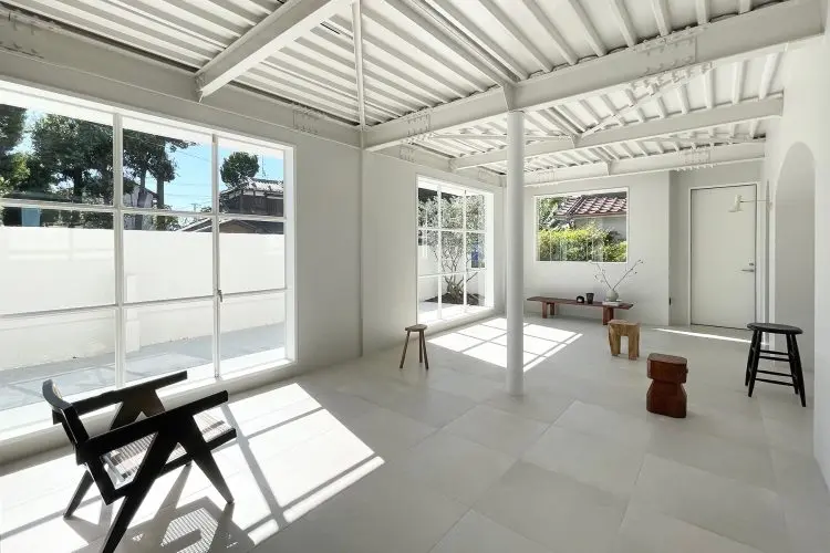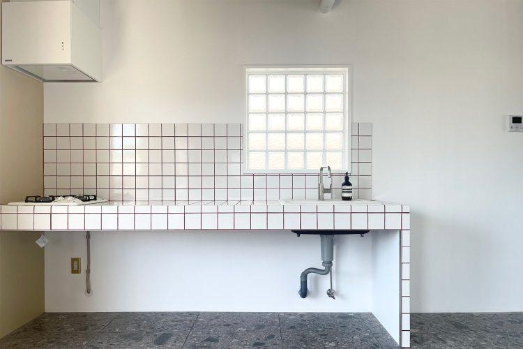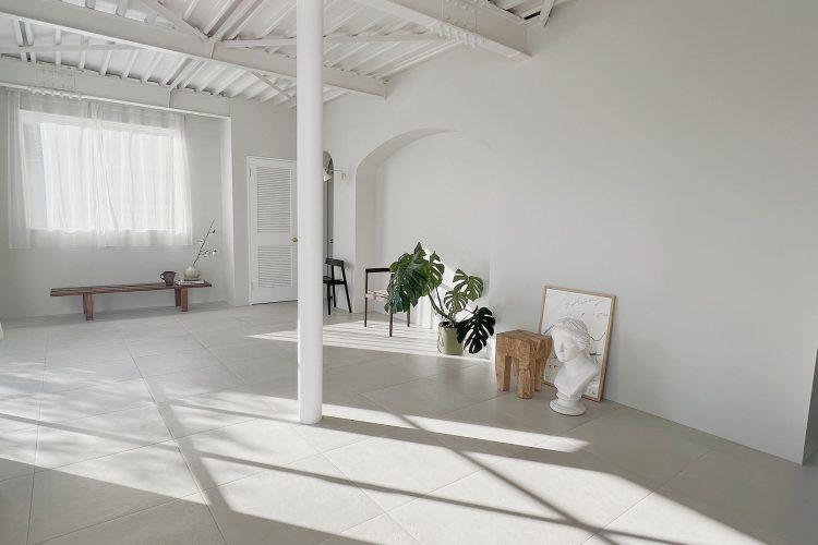 1階は、ヘリンボーンとモルタル、タイルで構成された白を基調とするスペース。居心地のよい部屋に綺麗に差し込む自然光は、被写体を美しく演出します。自然光がしっかり入るので一日中明るく、バリエーション豊富に撮影できます。