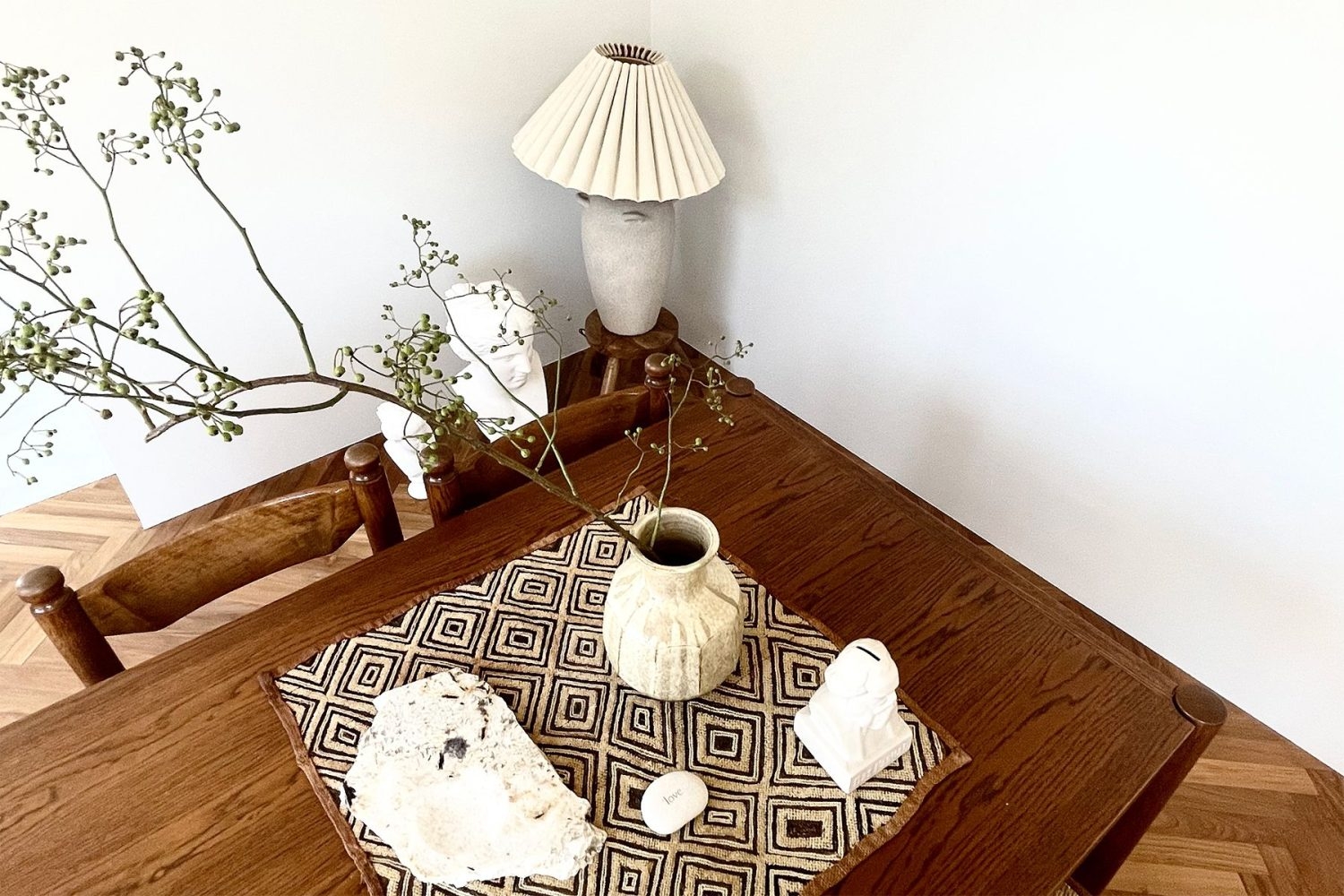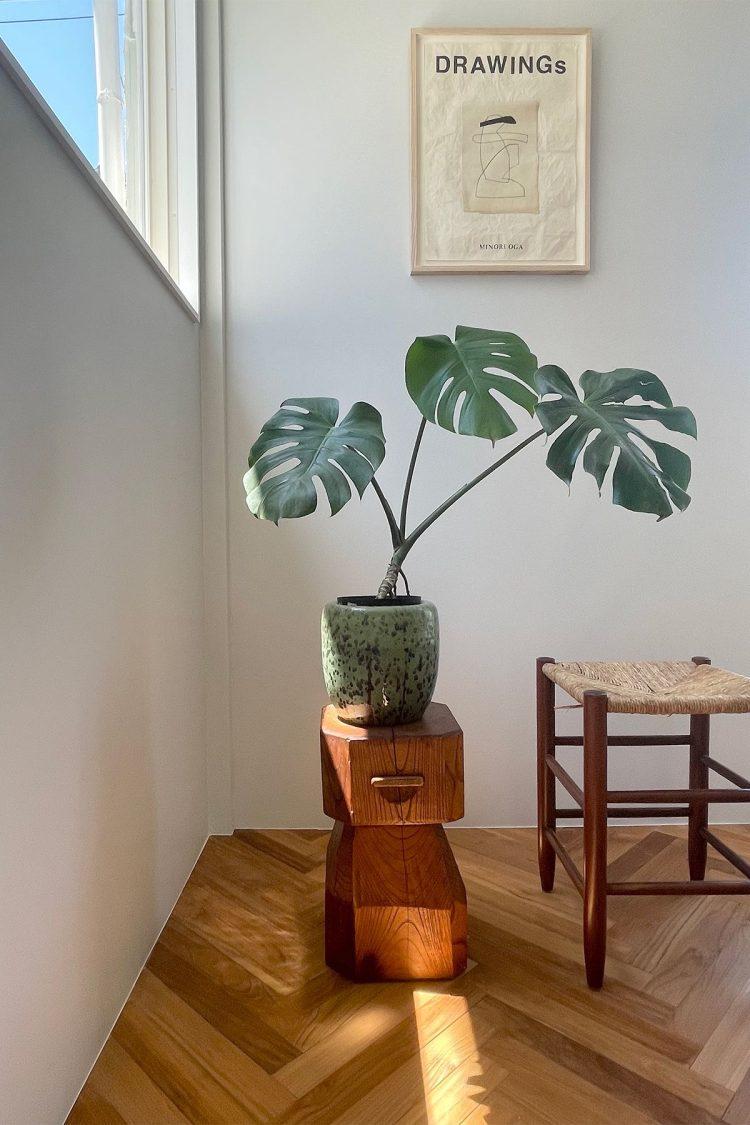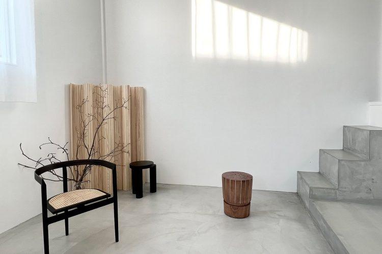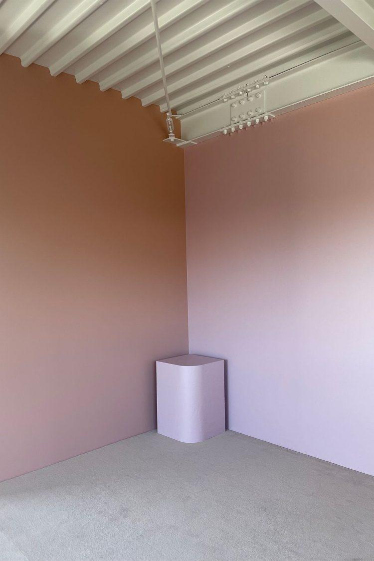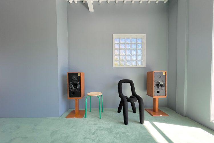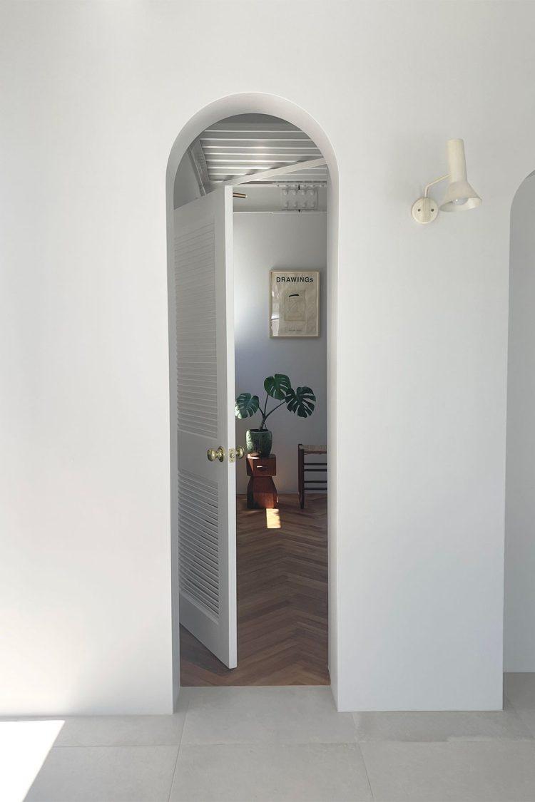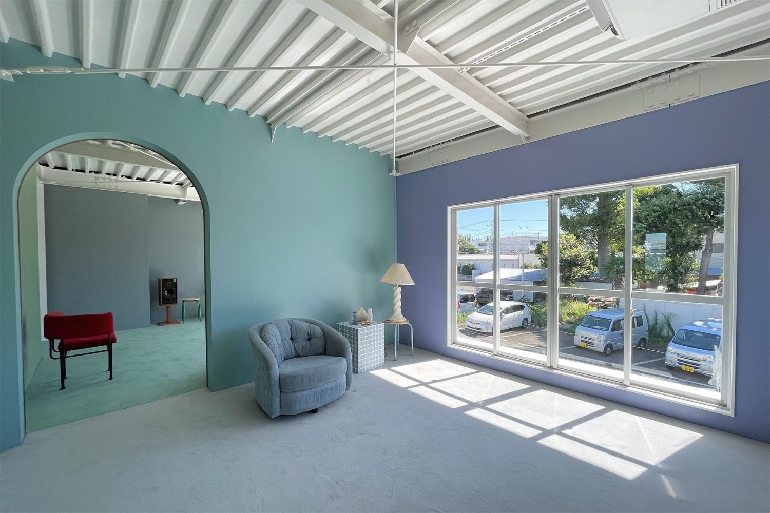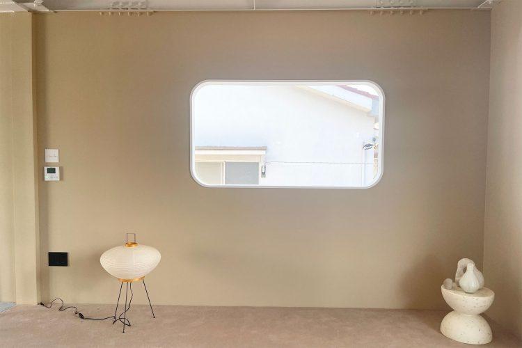 1階は白を基調とする空間、2階はくすみカラーの壁と絨毯で構成された2階建ての住宅。