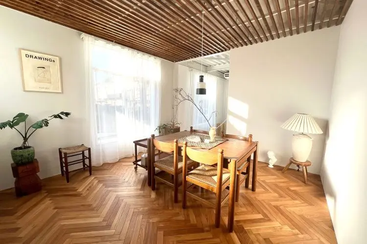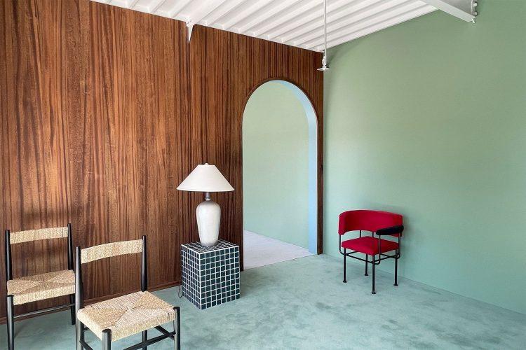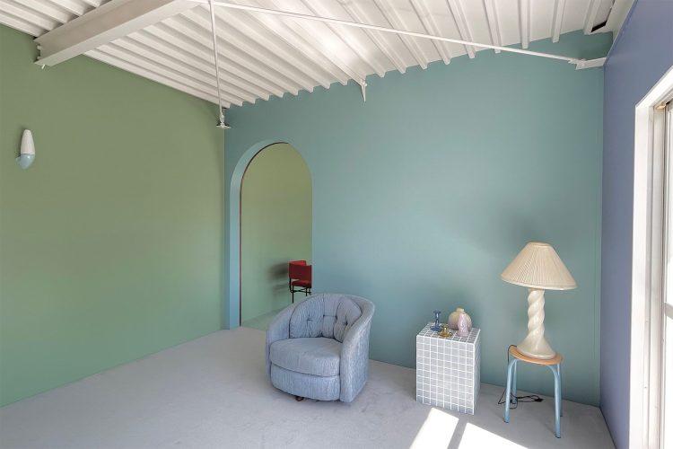 外階段を上がった2階は、ブルー、グリーン、ネイビー、ミントピンク、クリーム、グレーなどくすみカラーの壁とウッドパネルから構成され、赤を基調とするタイルのキッチンは特におすすめ。