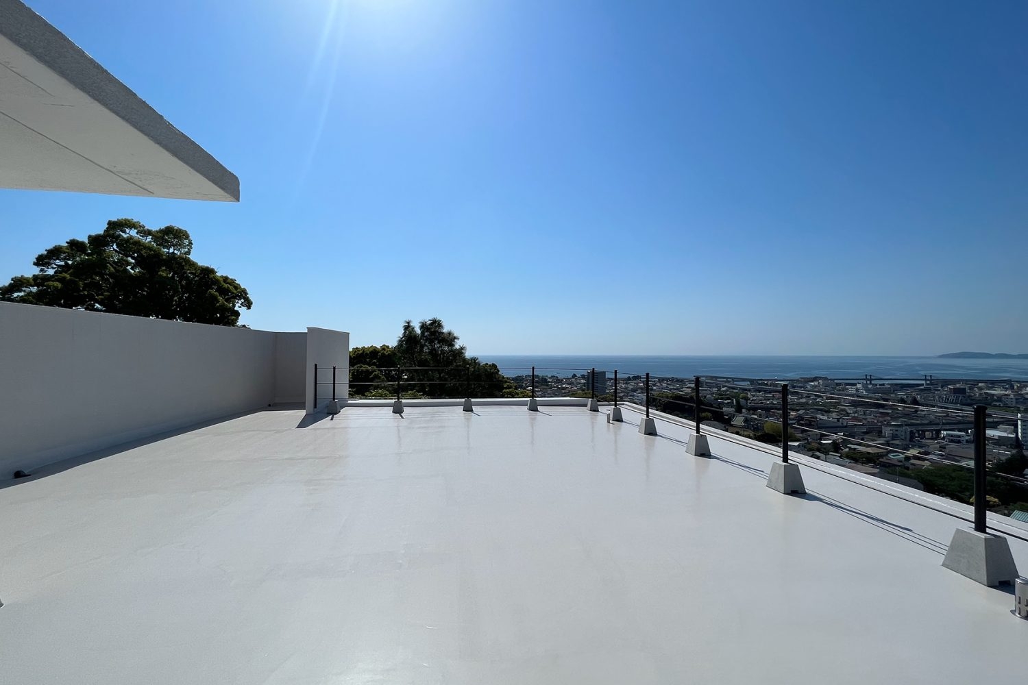 海と山を一望できる高台の絶景エリアにある4階建ての自然光の入る個人宅。