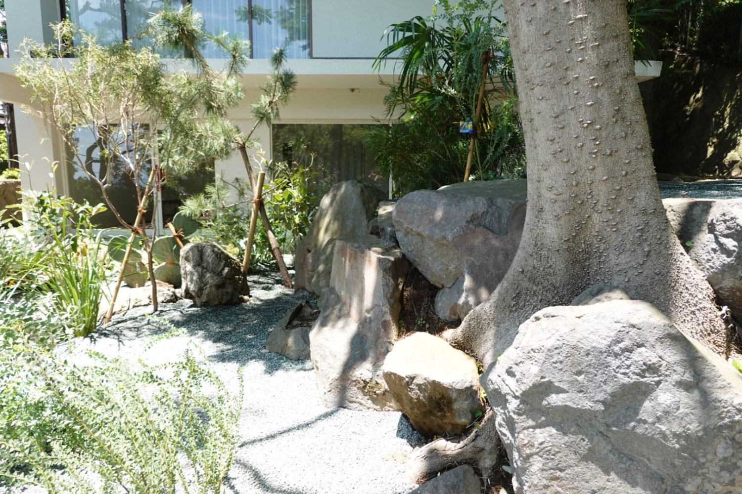 広大な敷地は木々と石、大きな岩に囲まれ、居心地も抜群。