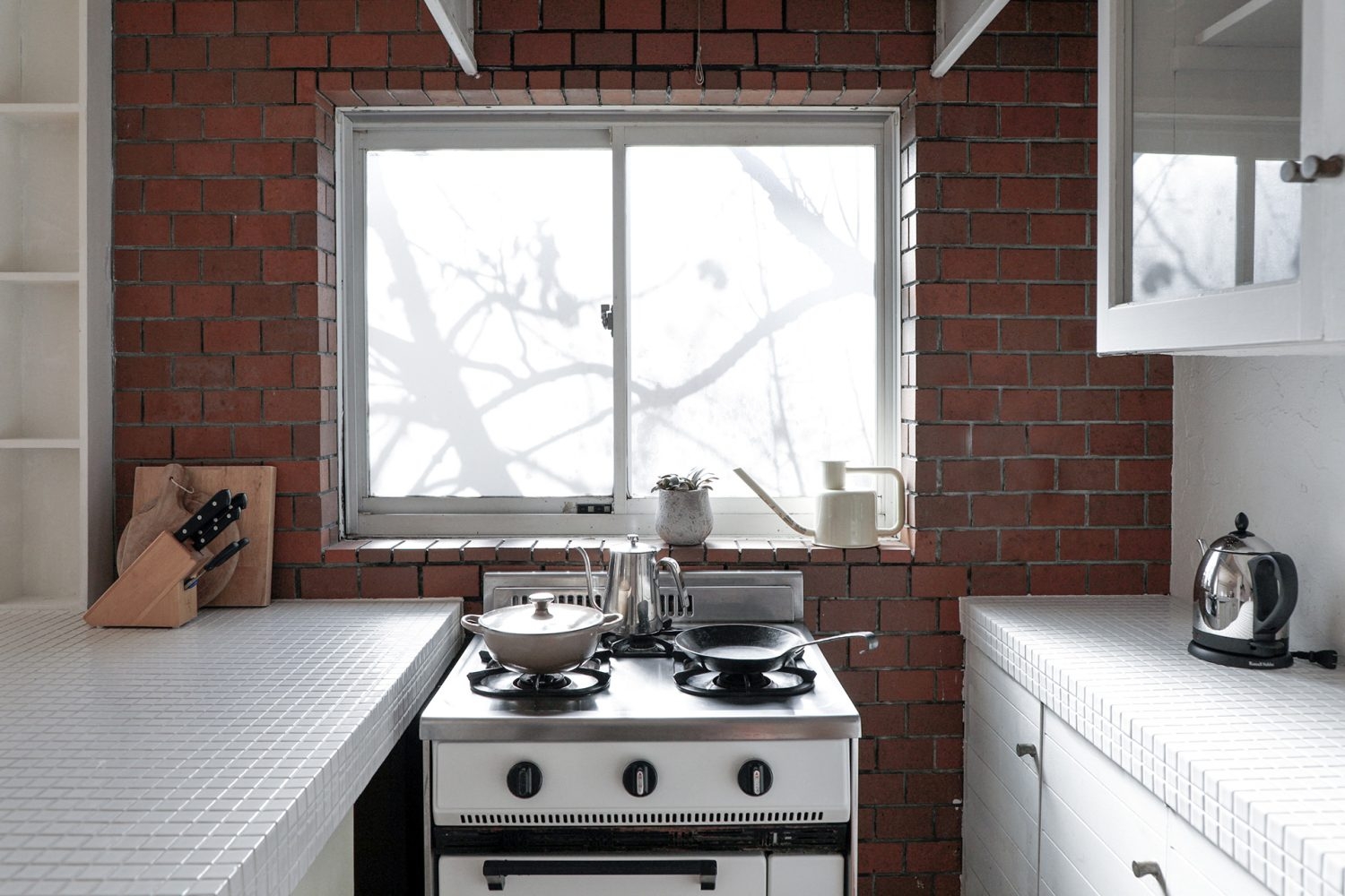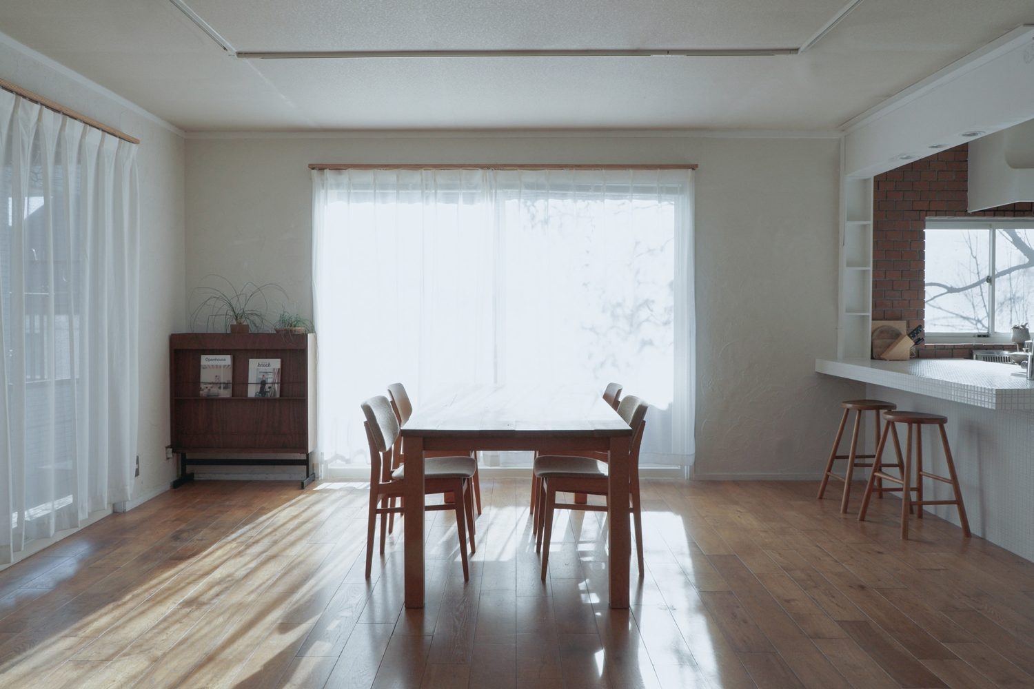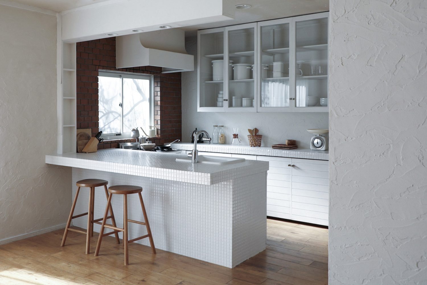 自然光の差し込むリビングルームは、優しい木目のフローリングと白い壁。飾り気のないナチュラルな雰囲気が魅力。キッチンは白のタイルと赤いレンガでお料理の撮影などに最適。