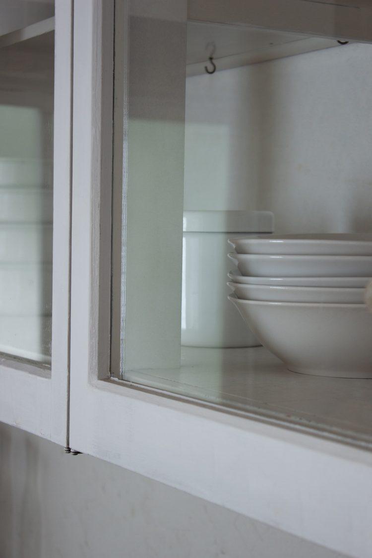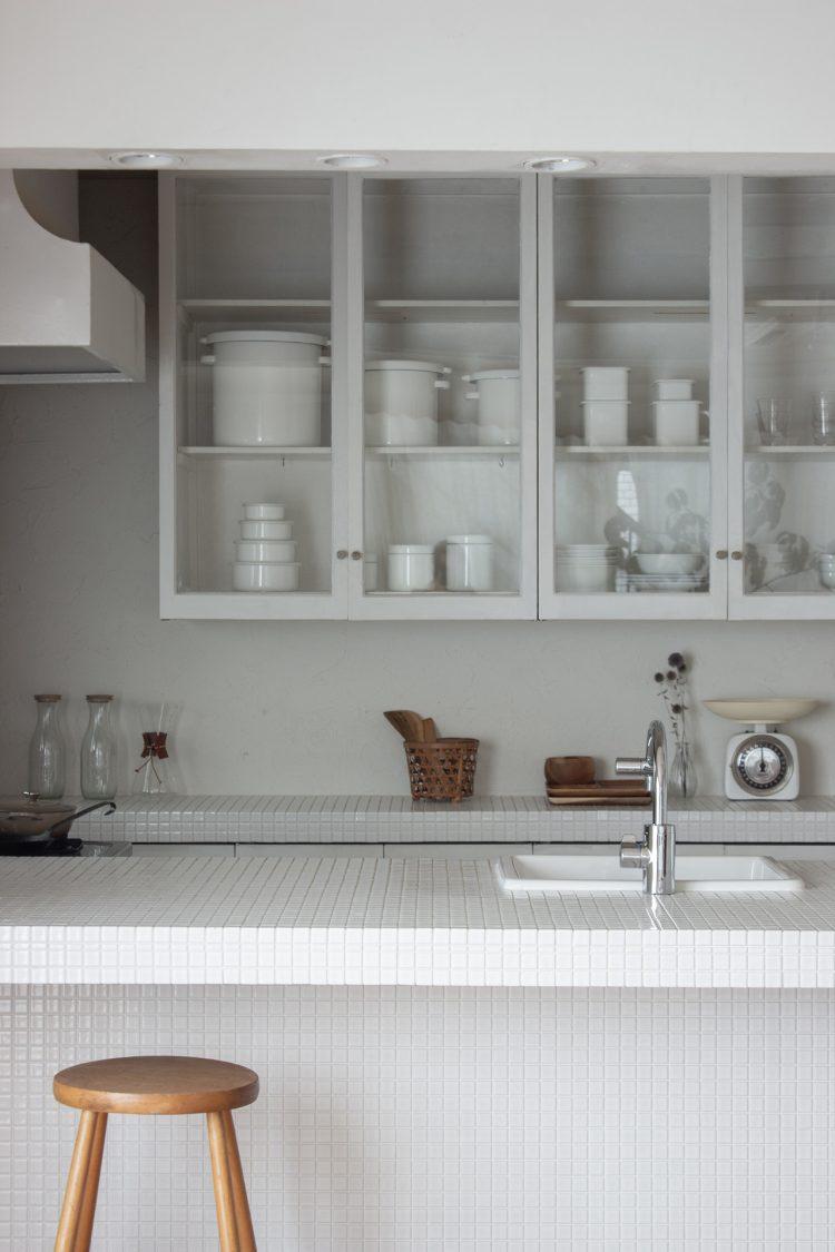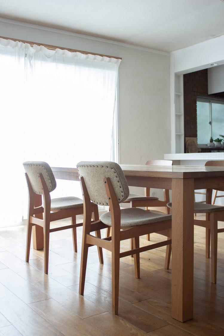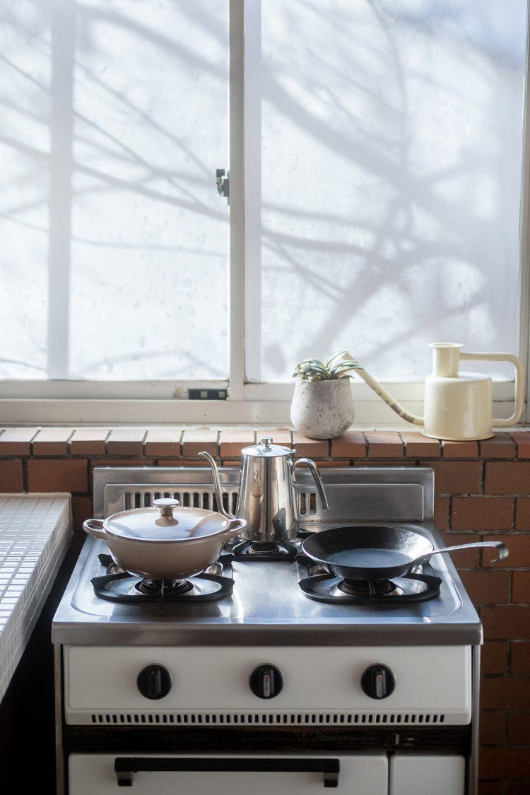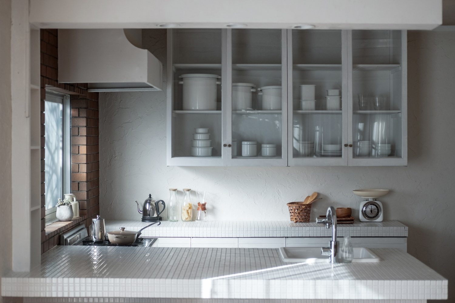 自然光の差し込むリビングルームは、優しい木目のフローリングと白い壁。飾り気のないナチュラルな雰囲気が魅力。キッチンは白のタイルと赤いレンガでお料理の撮影などに最適。