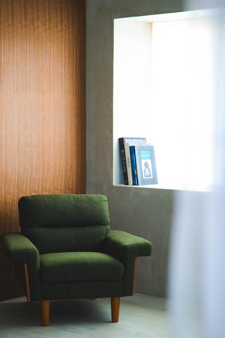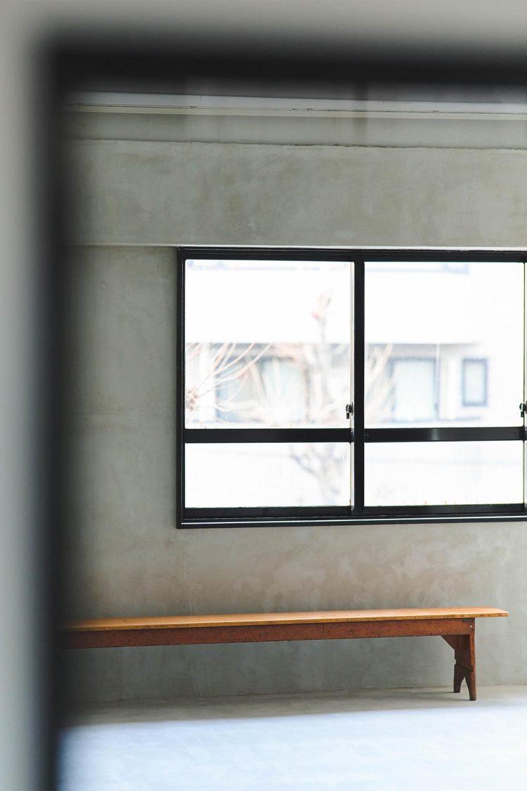モルタル仕上げのグレーの出窓から優しい光がウッド壁を、ブラック枠のハンサムな窓からは明るく白壁を、それぞれ質の違う光が素敵に照らします。 さらにコの字に設置された2ヶ所のカーテンレールにより、自由自在に動かせるレースカーテンが、より繊細な光のコントロールと手前ぼけなどの演出に役立ちます。