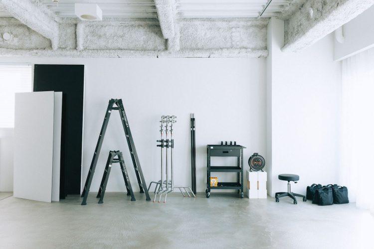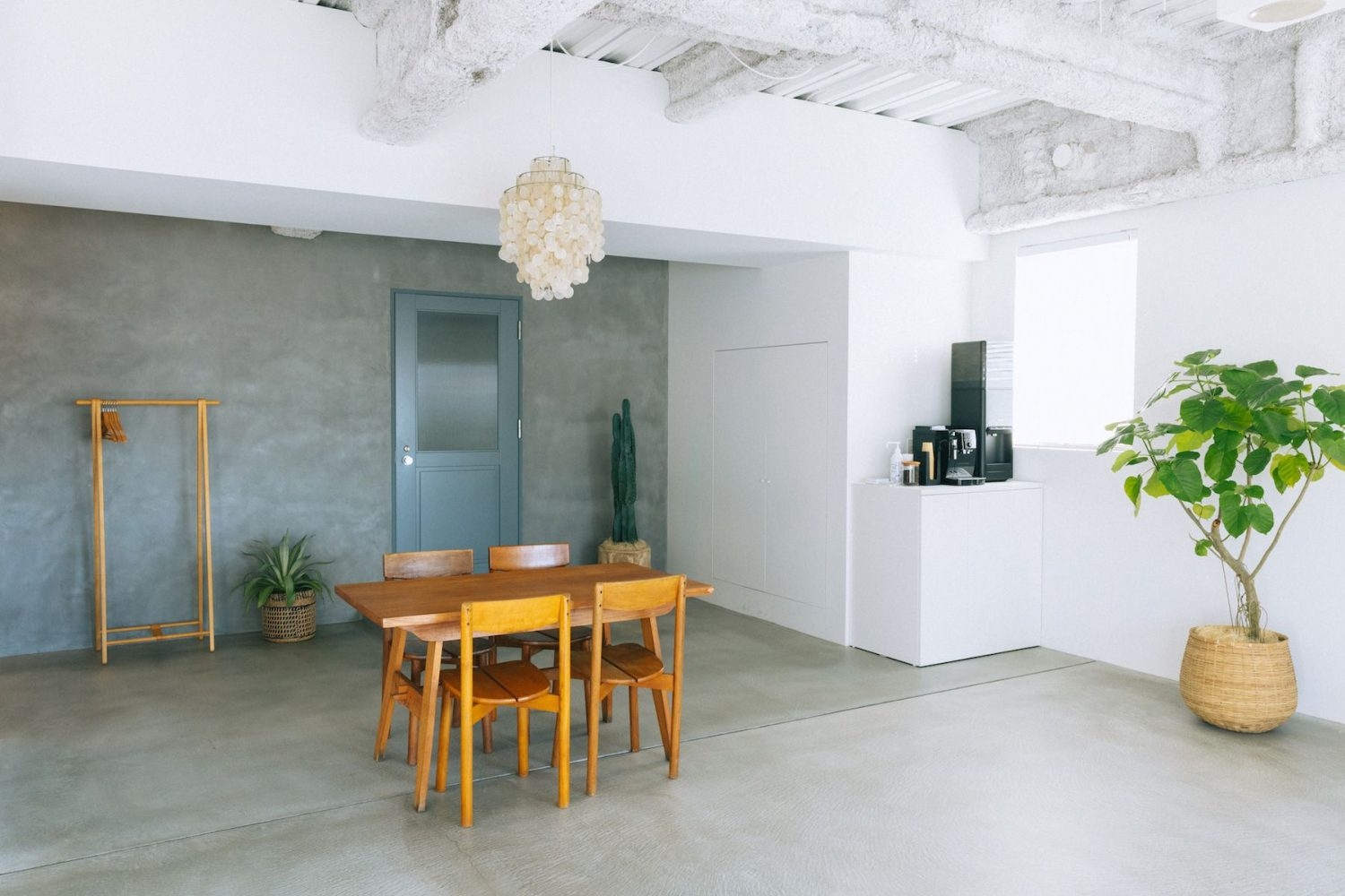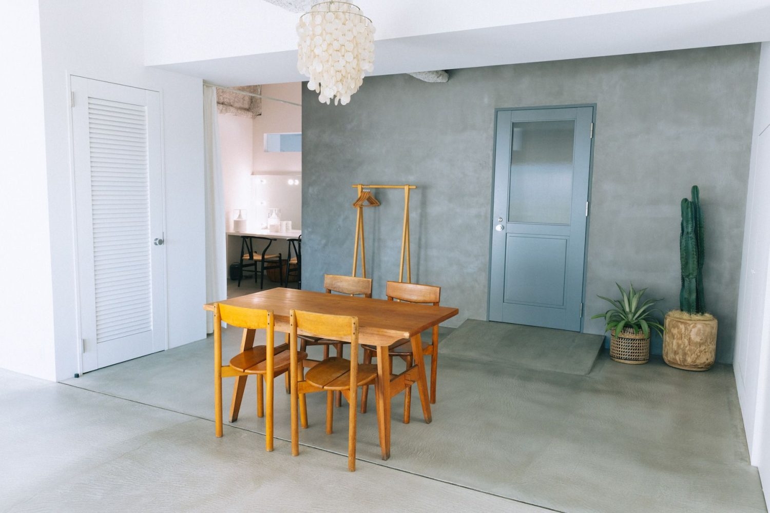 モルタル床に白壁のシンプルなスタジオです。一部モルタル壁もあり、いくつかのシチュエーションが作れます。