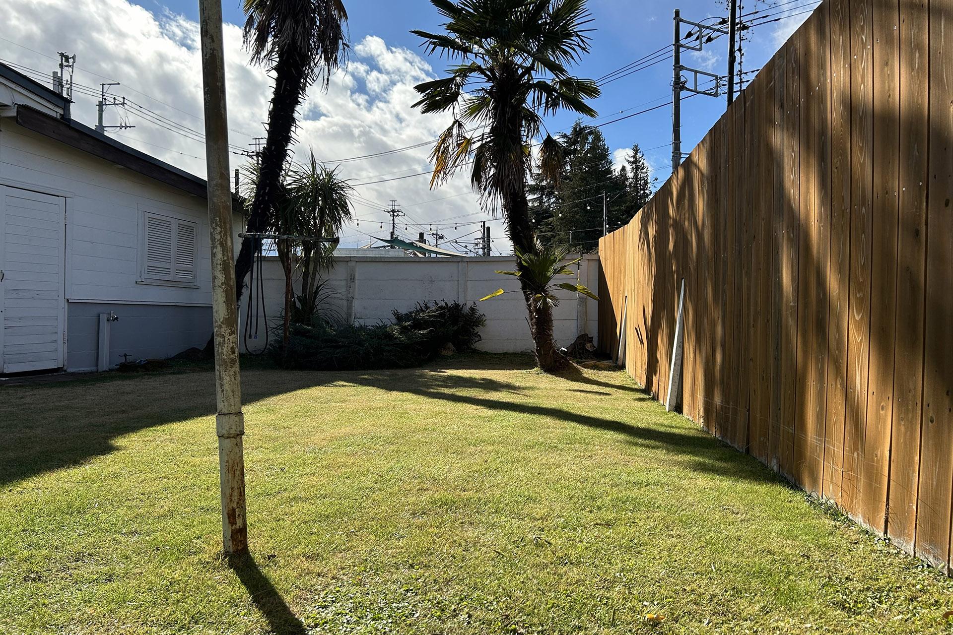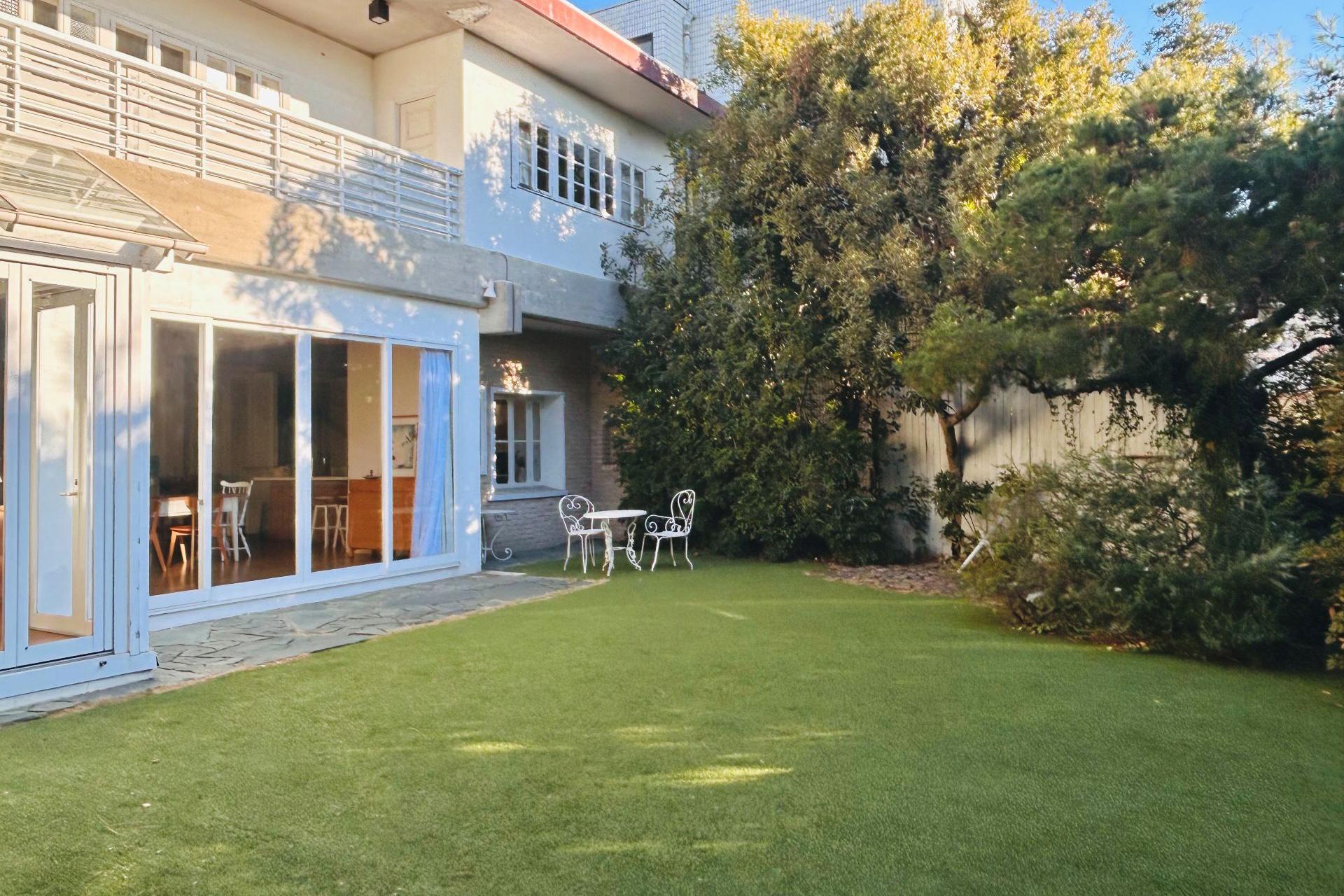 1950年代からアメリカ人が暮らしていた物件をリノベーションしたフラットハウス。バックヤードは芝が敷かれ、ヴィンテージ感あふれるスプリンクラーや屋外用の物干し台があり、生活シーンの演出に最適。横板張りのガレージドアや植栽を活かしたカットなど、フォトジェニックな背景が魅力。
