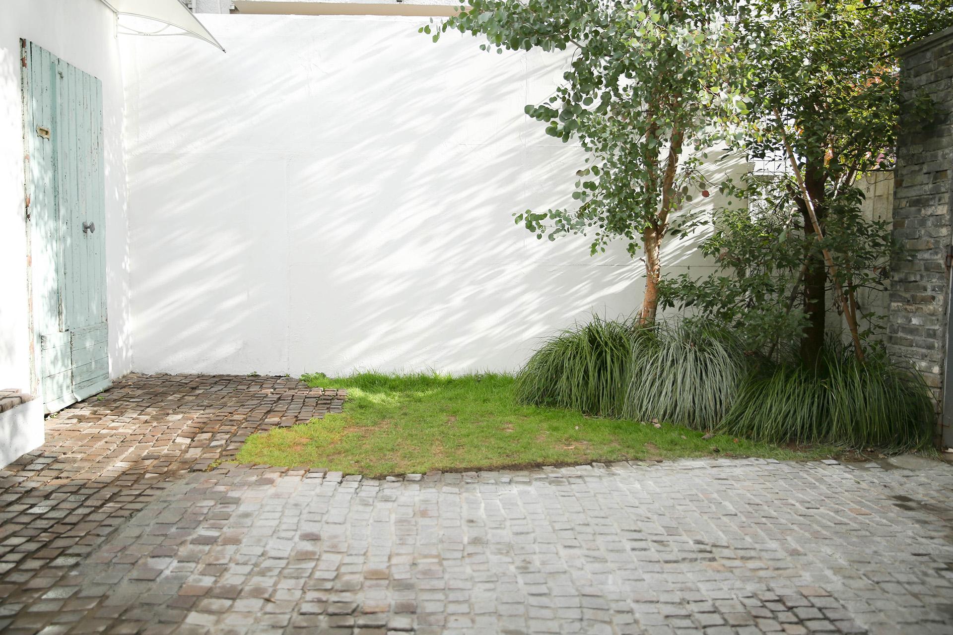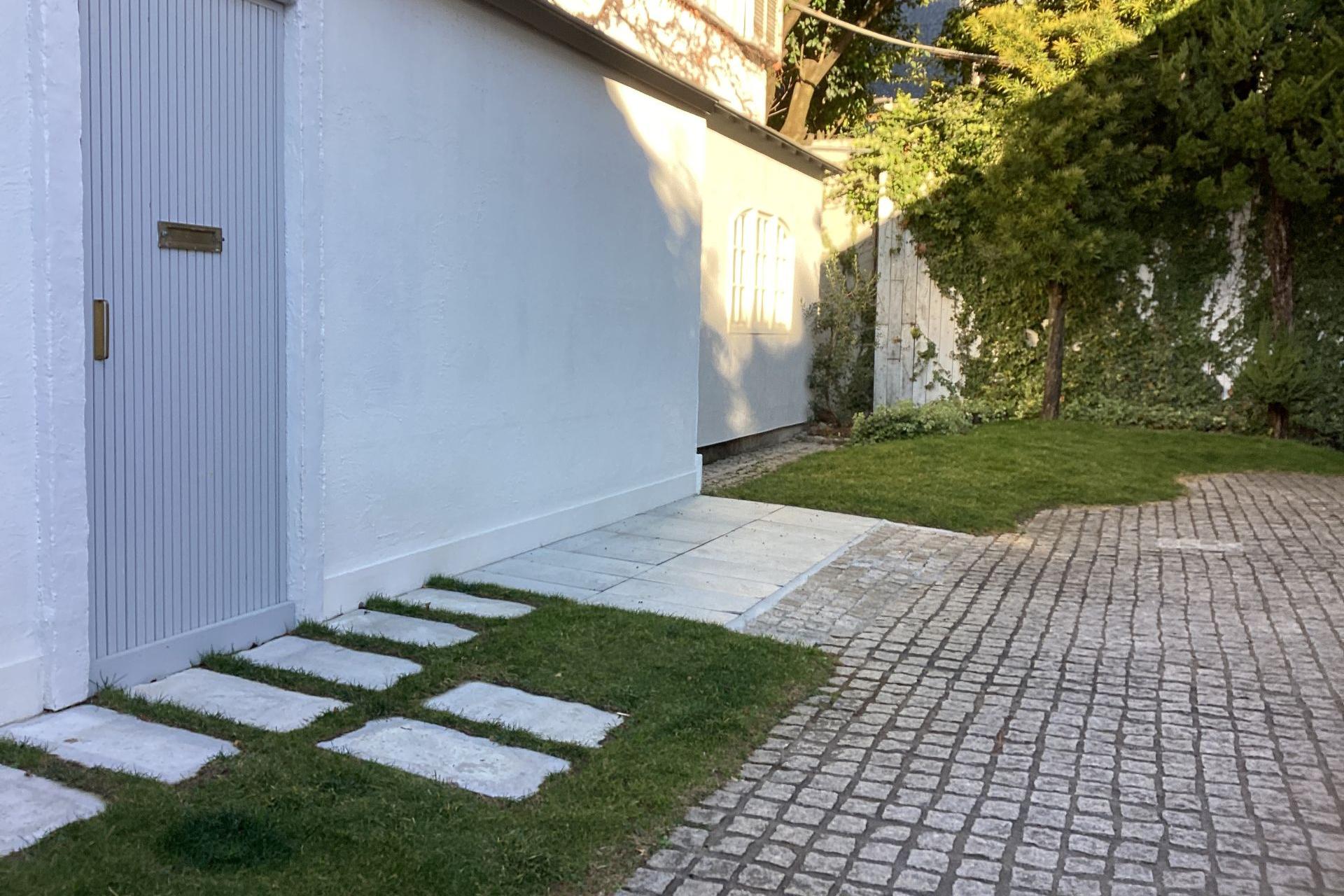 丁寧に敷かれた石畳がモダンで落ち着いた雰囲気を演出する約83㎡の庭。黒枠の扉とテーブルセットがオープンカフェのような雰囲気を演出し、ライフスタイルやカフェシーンの撮影に最適。石畳には車を入れての撮影も可能です。
