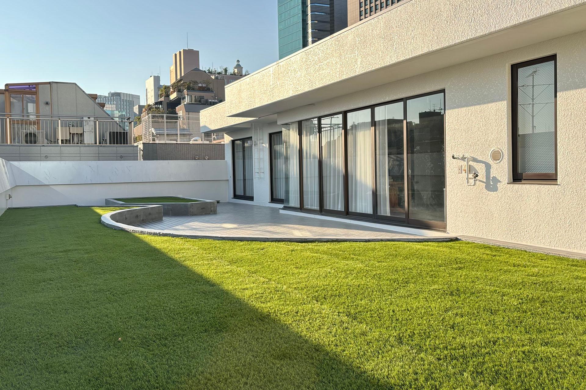 南青山のビルの3階に広々したテラスがあるスタジオ。約110㎡の南向きの庭は、リアルな芝に近い人工芝が一面に敷かれ、都会の中でも開放的な空抜けのあるロケーションです。室内はモルタル床とヘリンボーン床の2面に分かれた空間でダイニングの窓からはテラスが見渡せる造りになっています。
