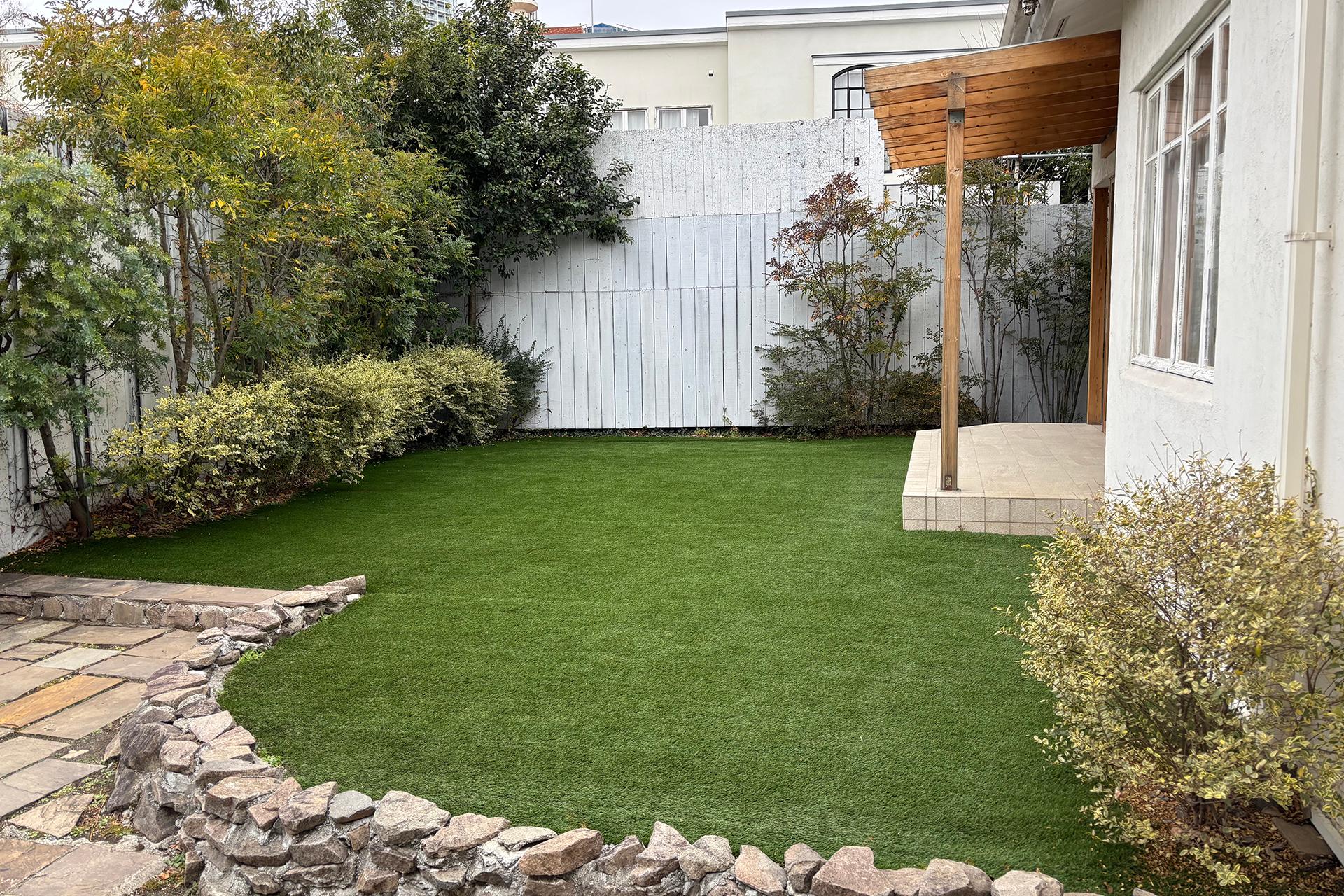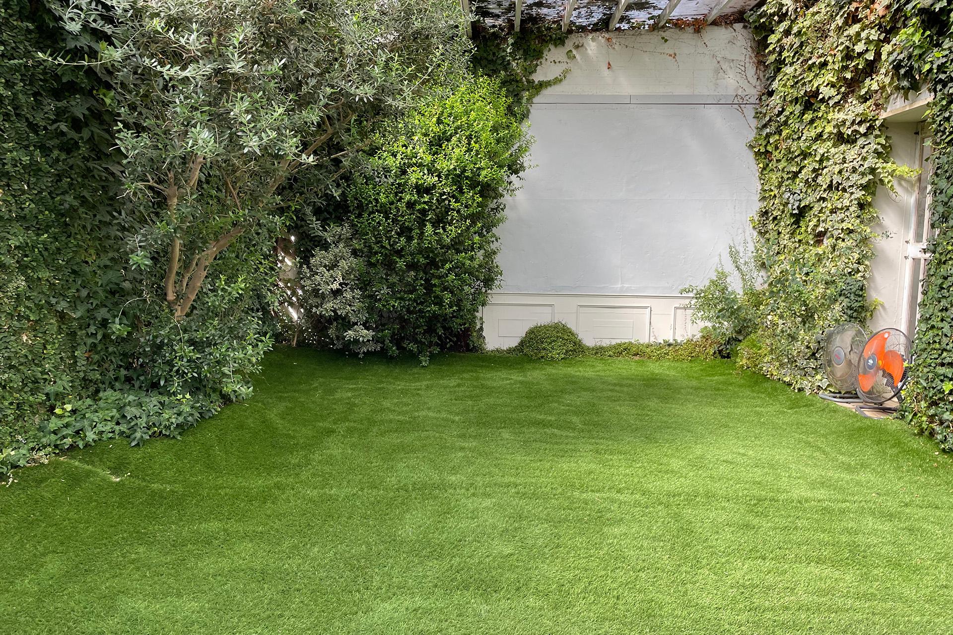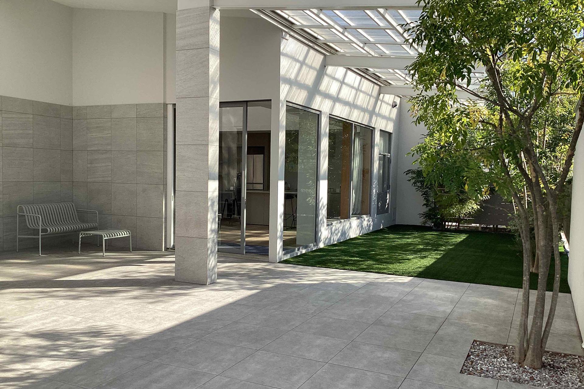 1960年代の南カルフォルニアをモチーフとしたフラットハウス。ゆるやかなアプローチと広い芝生が映えるエントランス。開放感のある引きの画から、建物に近づく動きのあるカットまで幅広く対応できます。日々メンテナンスを重ね、四季を通し鮮やかなグリーンを維持し、裸足で楽しめて安心して寝転べる天然芝環境を整えています。