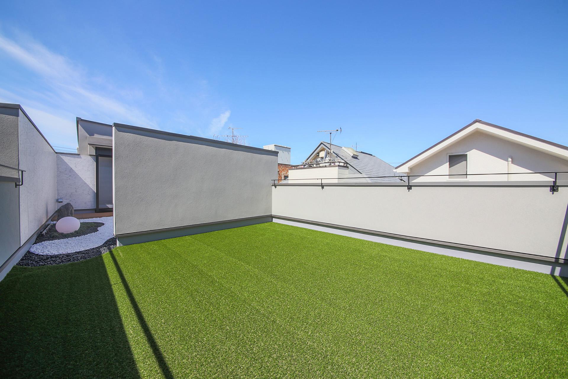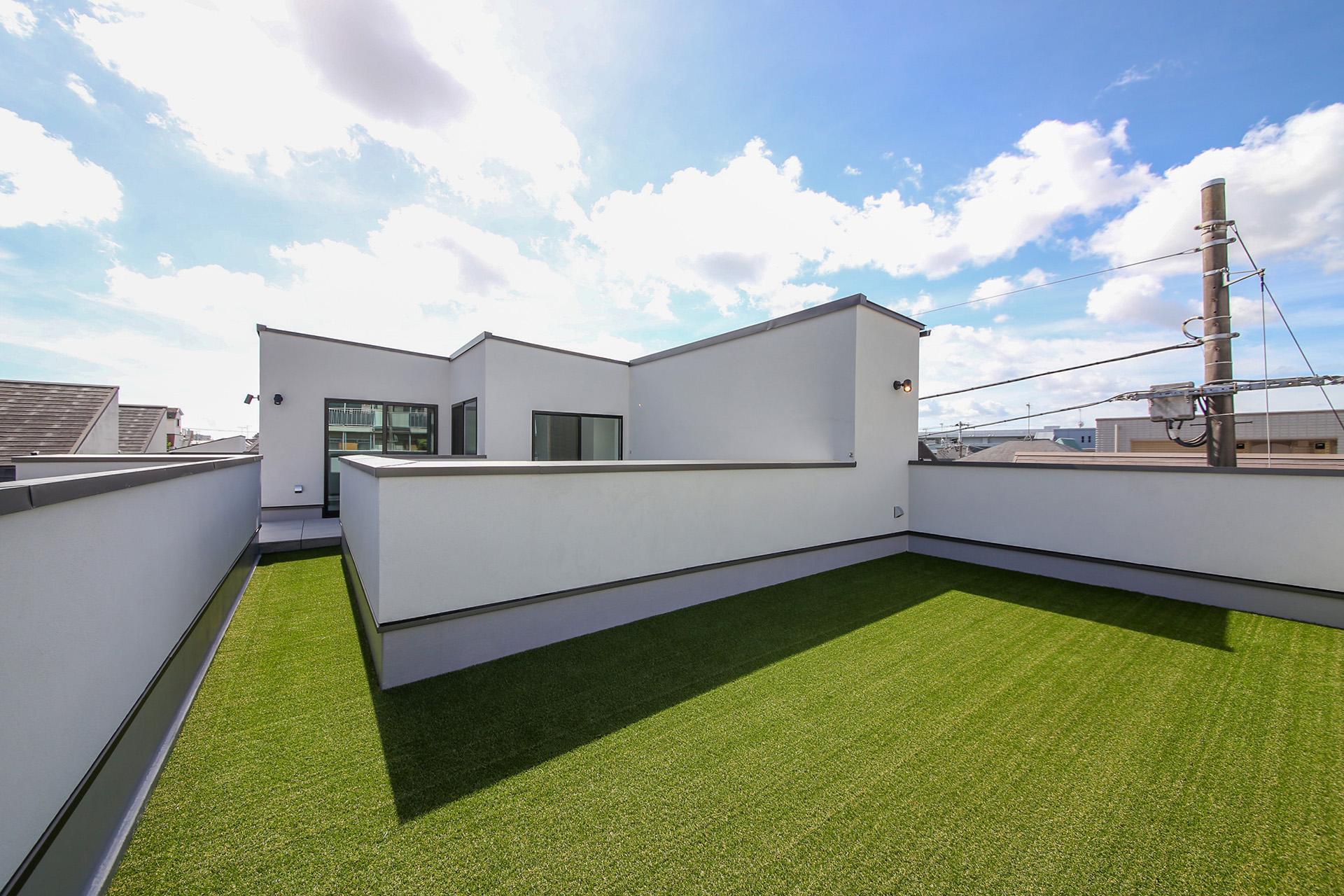 モダンで高級感ある3階建てスタジオの屋上。開放感ある人工芝のスペースのほか、タイルのバルコニーや1階から空が抜ける吹き抜けの中庭も。室内はキッチン、ダイニング、リビング、玄関など豊富にシチュエーションが揃います。
