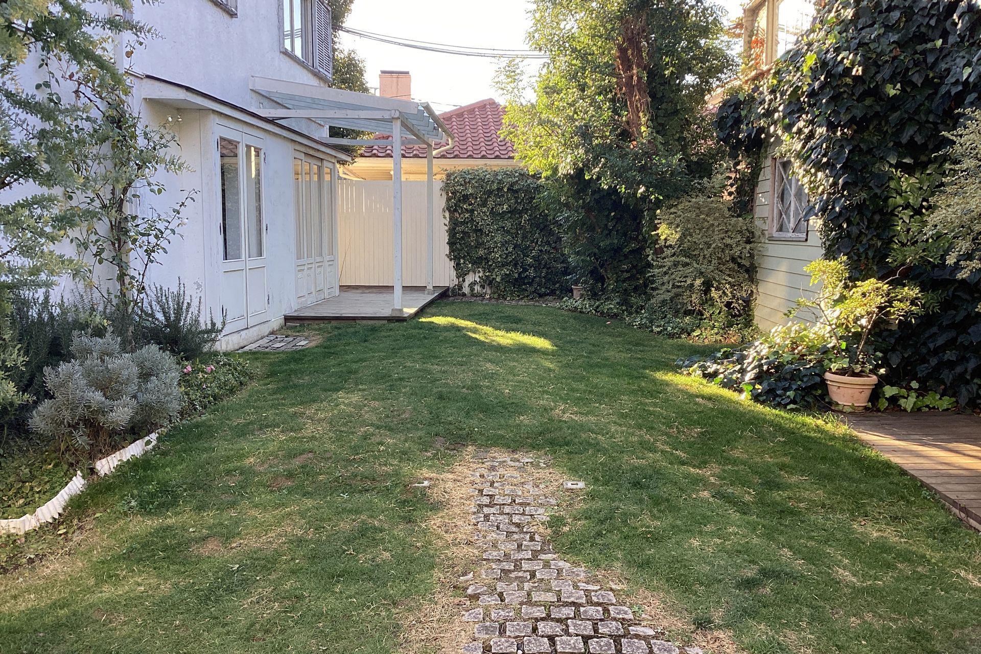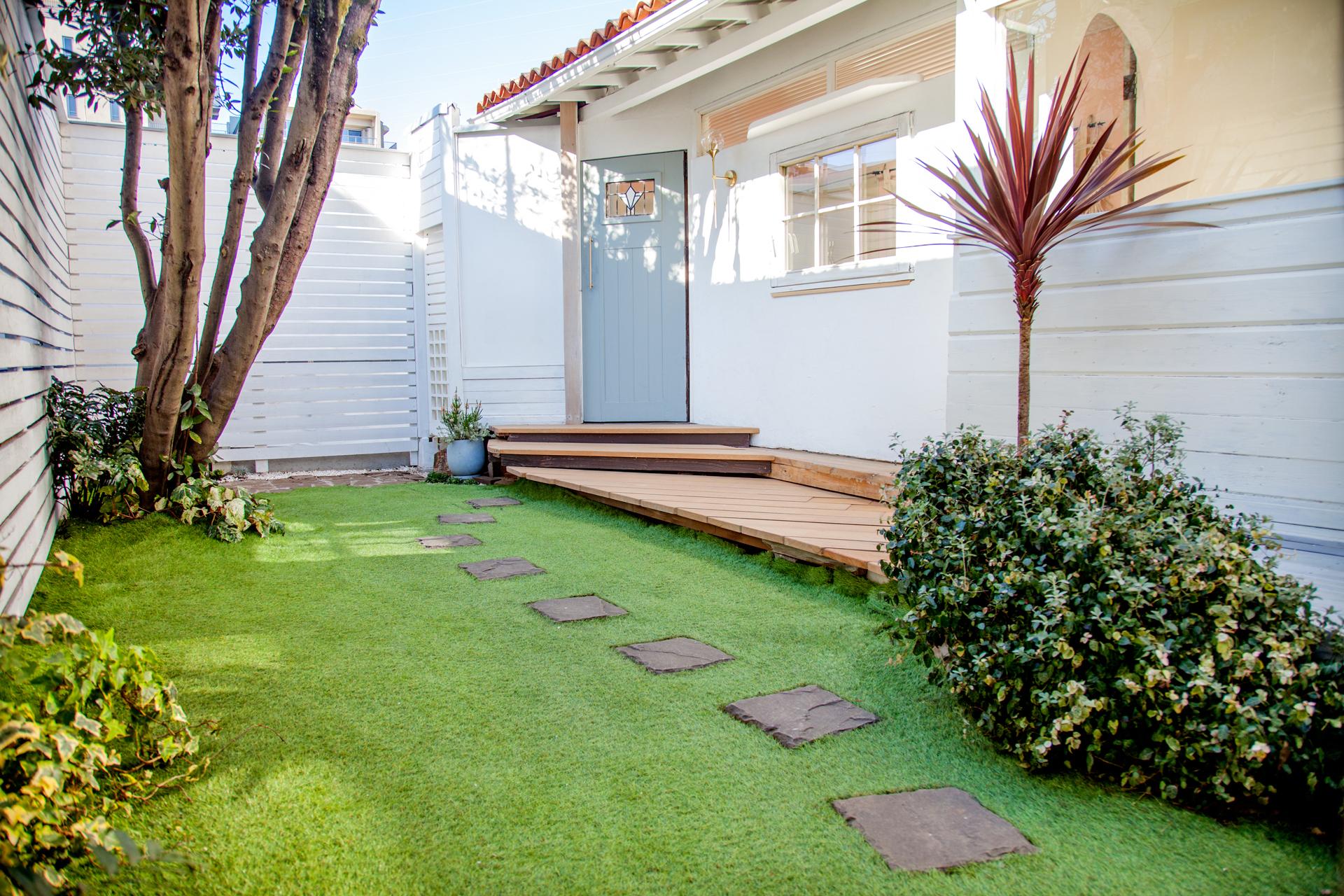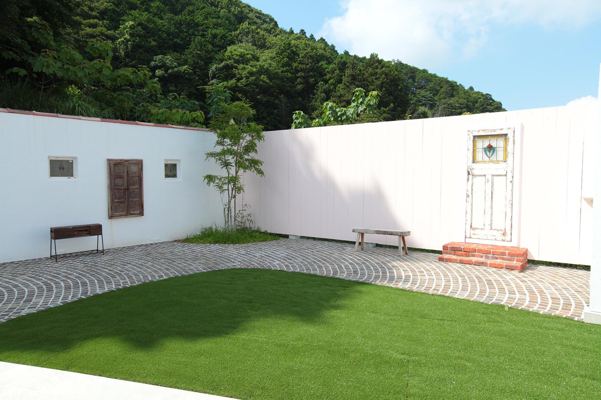 ヴィンテージ感とナチュラルさが調和したかわいらしい一軒家スタジオ。緑に囲まれた庭は、芝生・レンガ畳・枕木の組み合わせが印象的です。庭は玄関へと続く動線になっているため、外出や帰宅シーンなど、玄関まわりの演出にも最適。