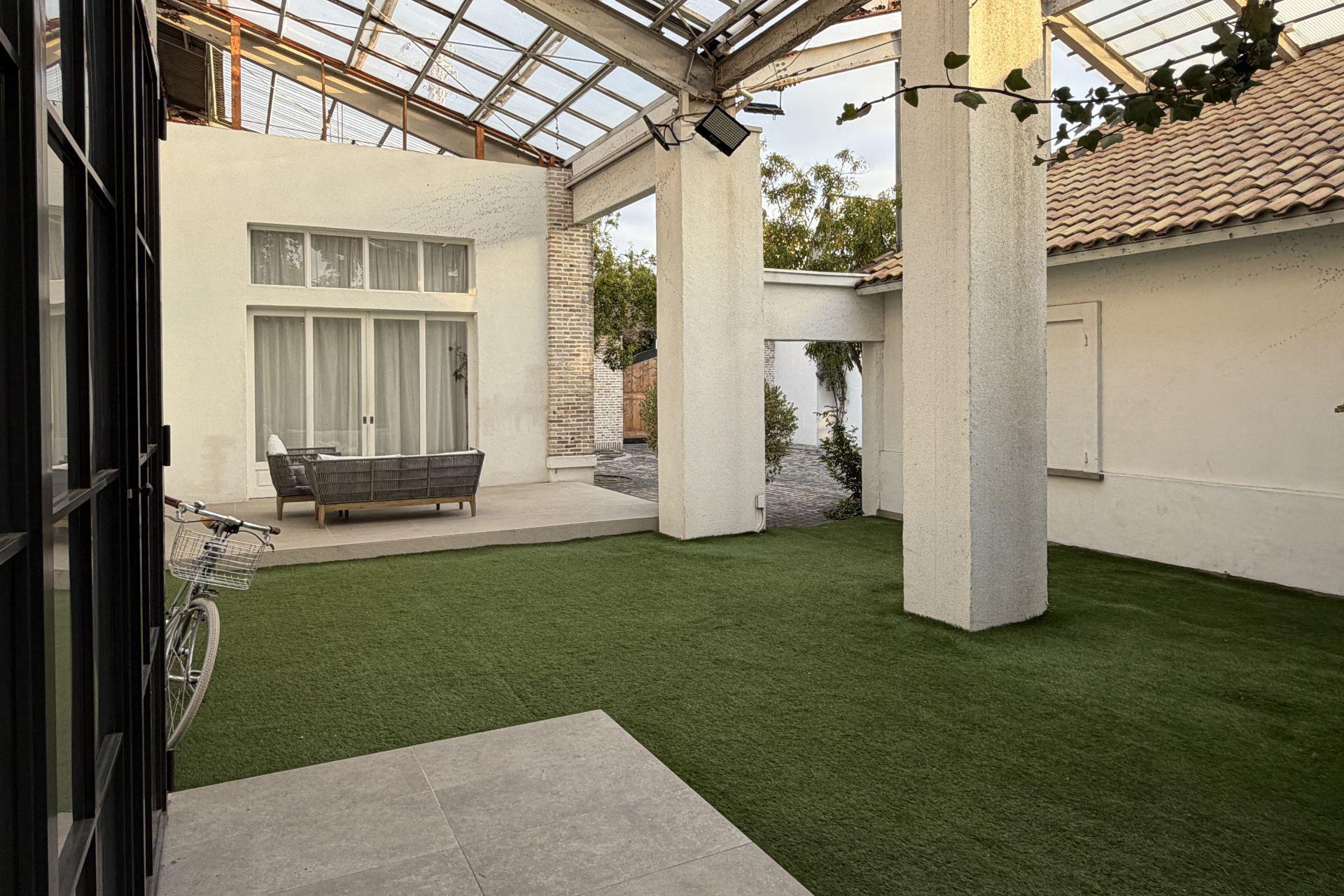 屋根付きの庭はスケルトンの天井になっており、やわらかな自然光が差し込み、雨でも濡れずに撮影できるのが魅力です。庭に面した壁には蔦が這い、扉やアイアン窓が雰囲気ある背景に。人物撮影はもちろん広告ビジュアルにも最適です。