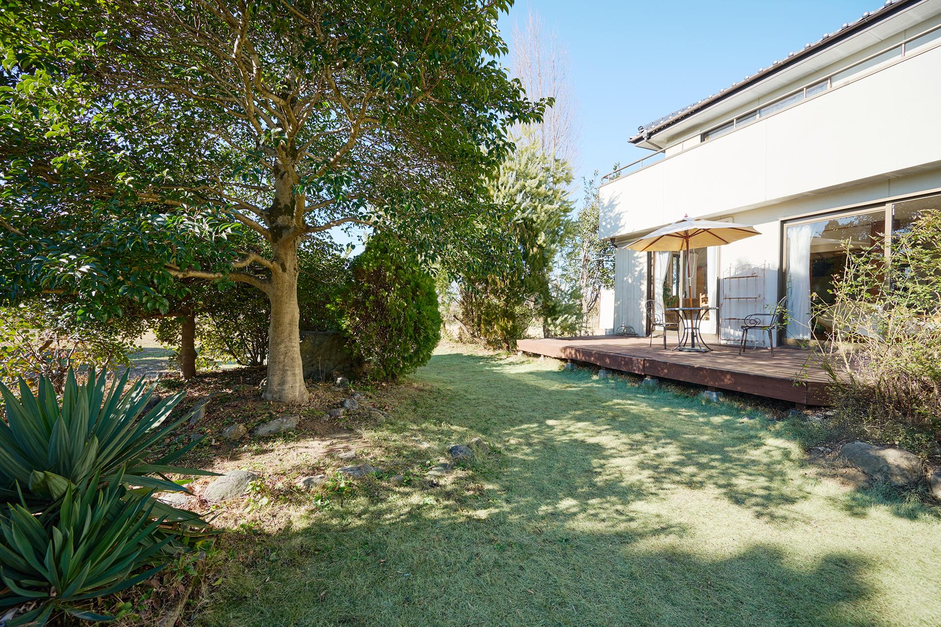 十分な高さのある天窓から自然光をふんだんに取り込むナチュラルな一軒家スタジオ。リビングの大きな木枠の引き戸を開けると、タイルデッキが続き、その先には緑の芝生の庭が広がる抜群の開放感が特徴です。屋内外をつなぐシームレスな動線は、団欒シーンの背景にも最適です。