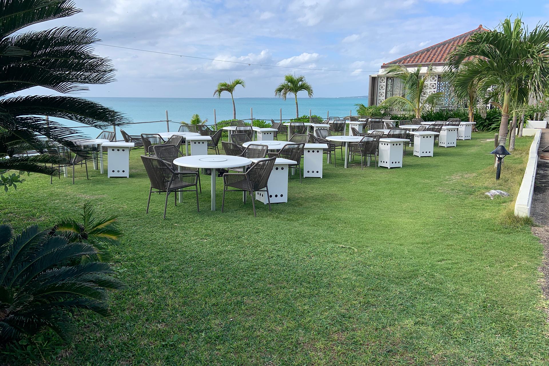 宮古ブルーの海が広がるオーシャンビューリゾートホテル。海を目の前に冬でもグリーンの芝が広がります。ホテルの室内や、ラグジュアリーなロビーやレストラン、プール、さらにはヨットでの海上撮影まで、バリエーション豊富に撮影が叶います。机と椅子がない時期もあるので事前にご確認ください。
