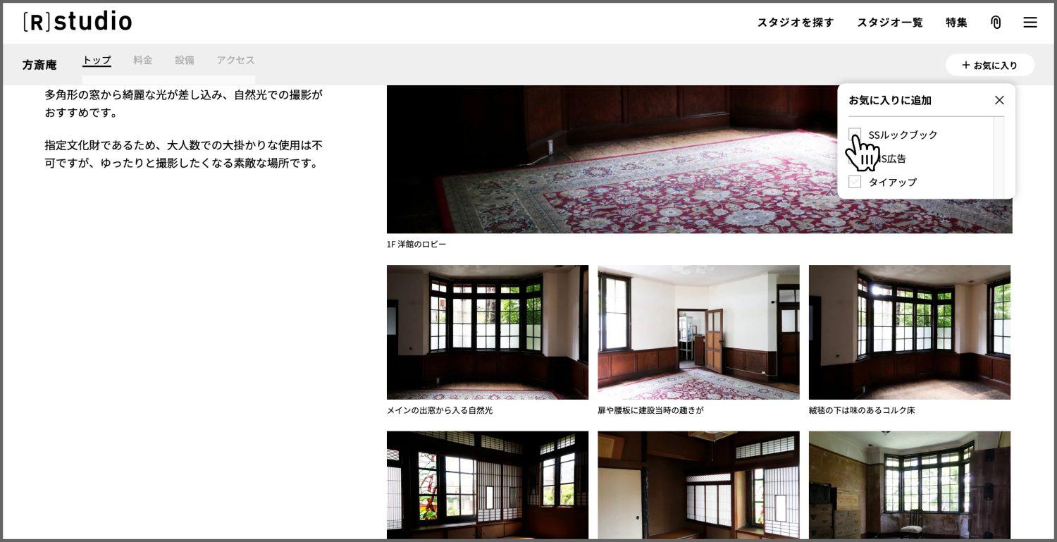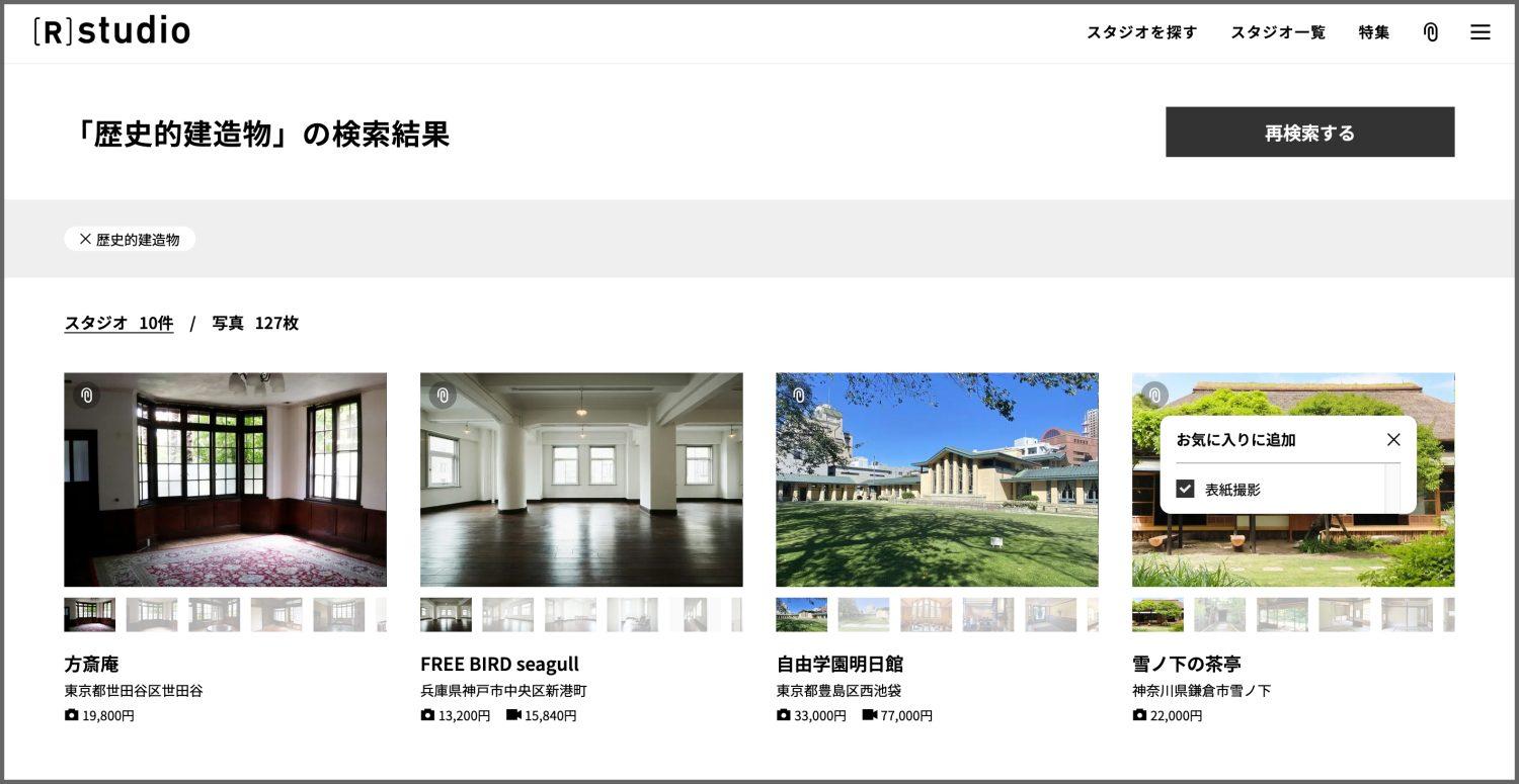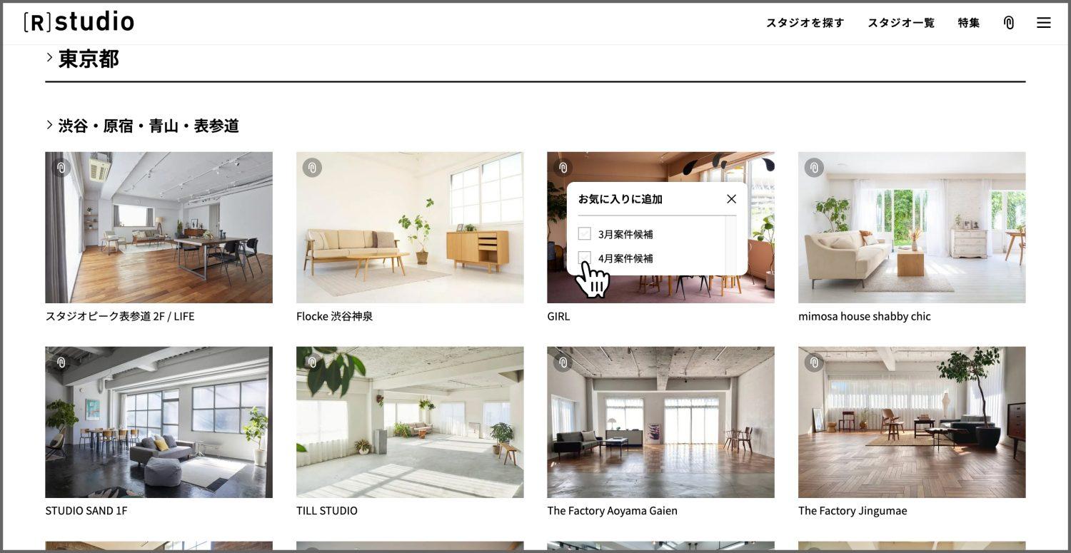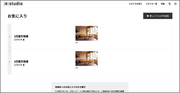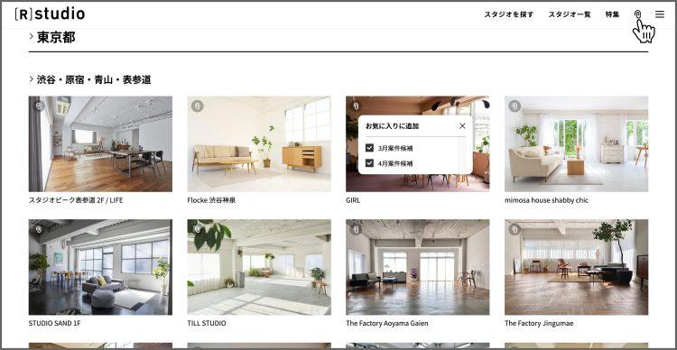 検索結果表示はスタジオ / 写真と切り替え可能ですが、スタジオ表示のみお気に入りへ登録できます。