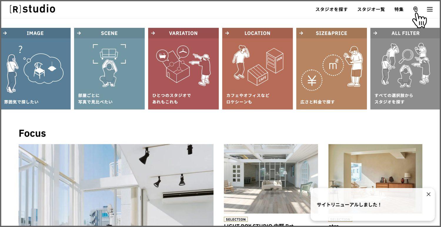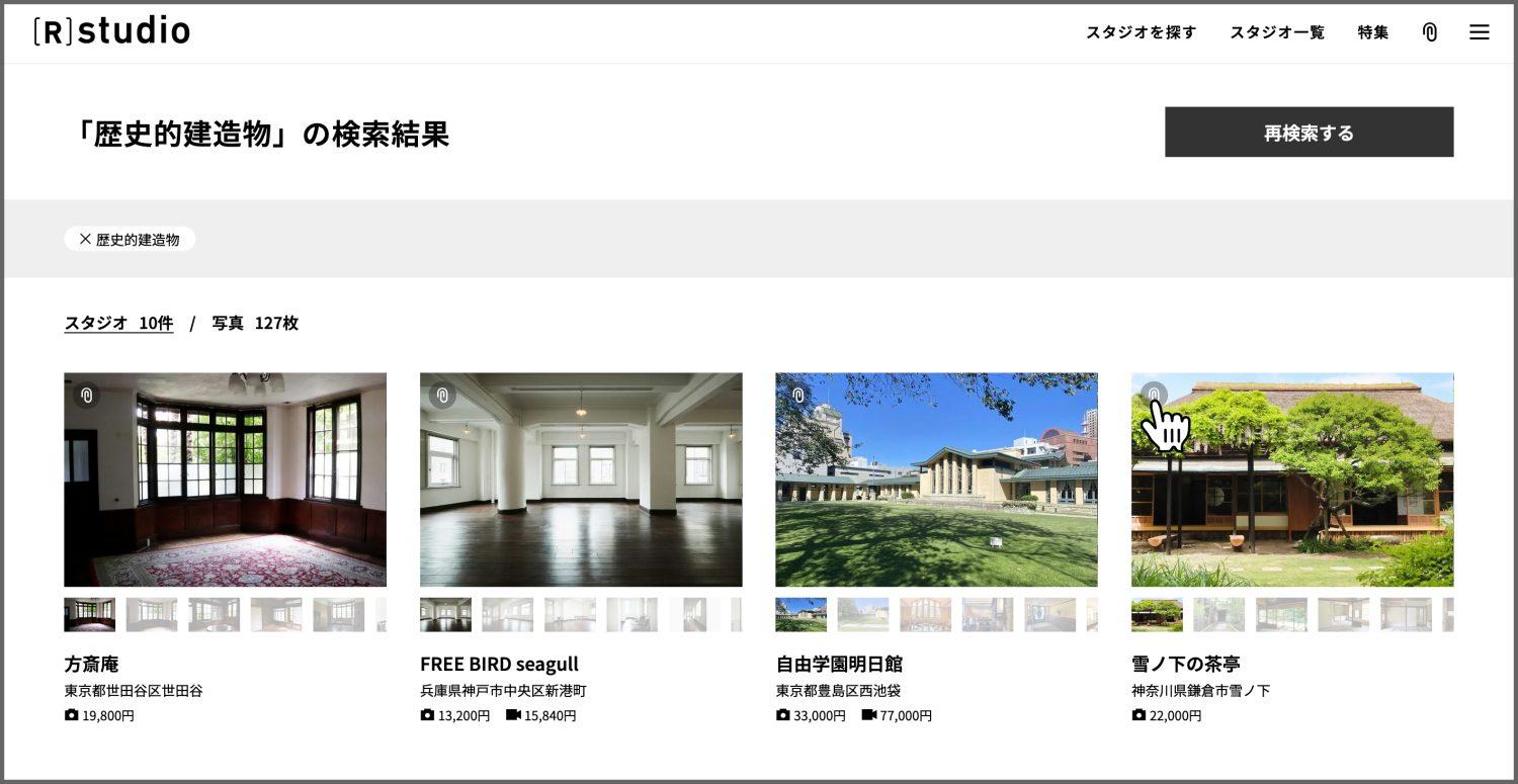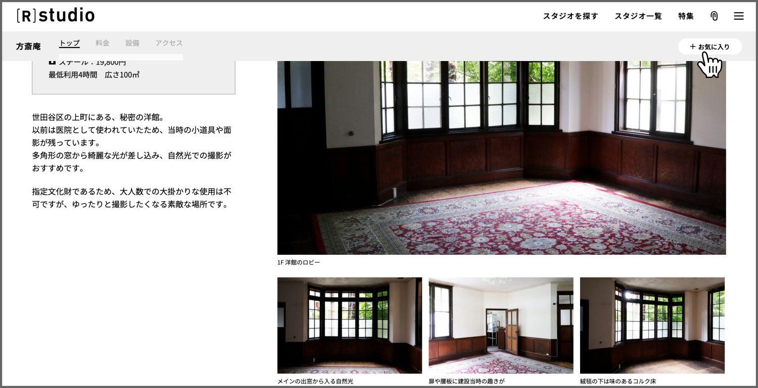 検索結果表示はスタジオ / 写真と切り替え可能ですが、スタジオ表示のみお気に入りへ登録できます。