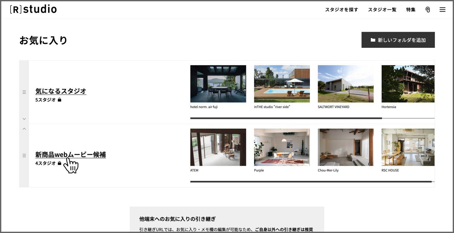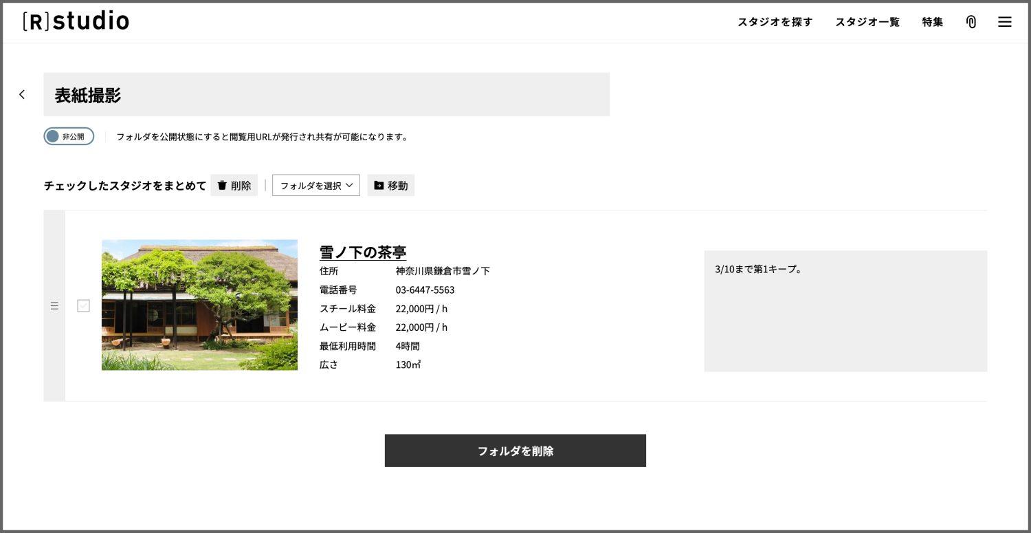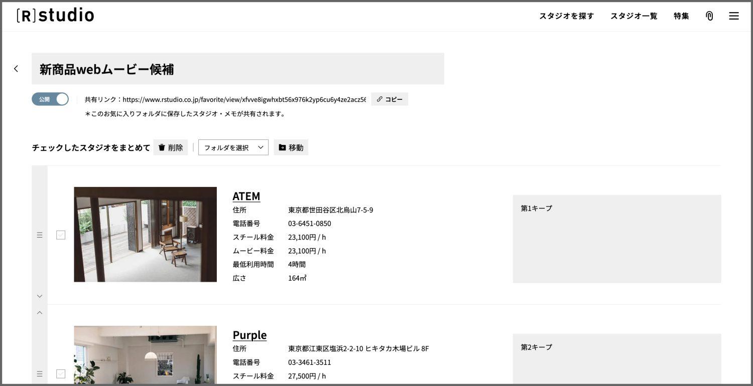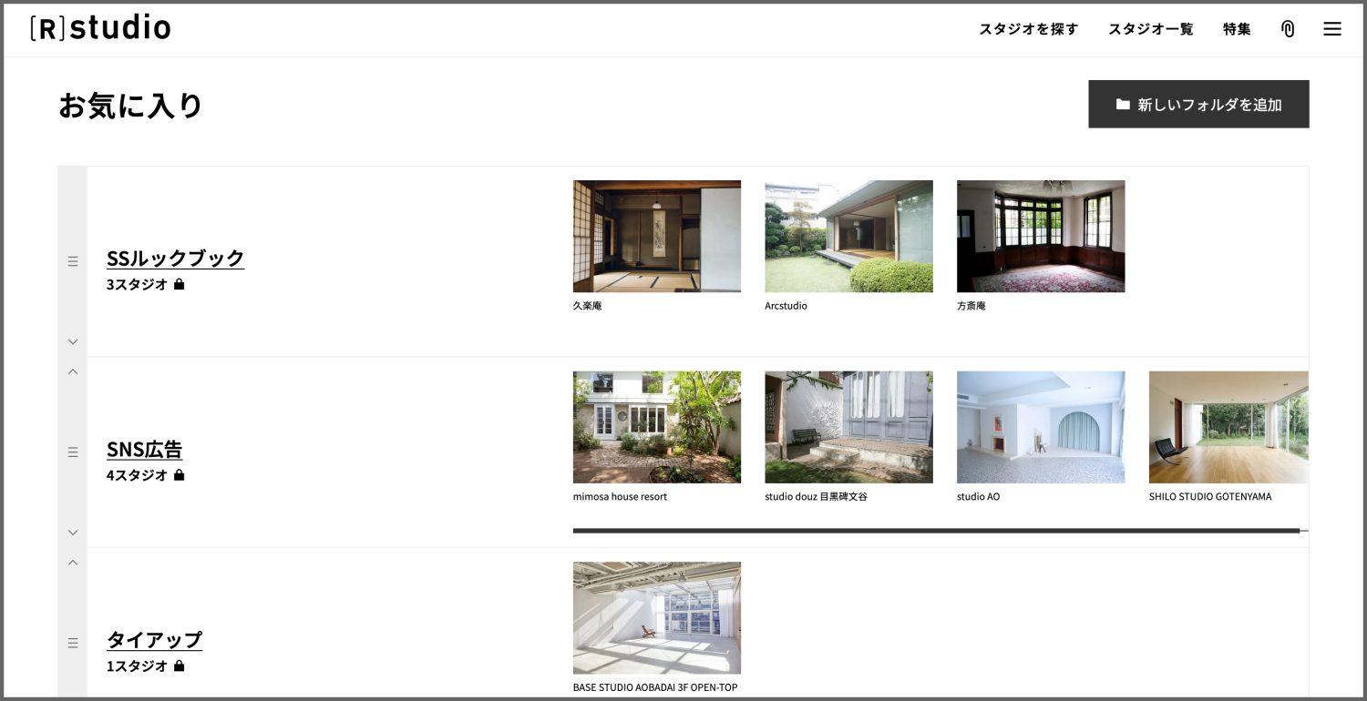 気になったスタジオを撮影案件ごとにフォルダで管理でき、仕事仲間に共有も可能です。
