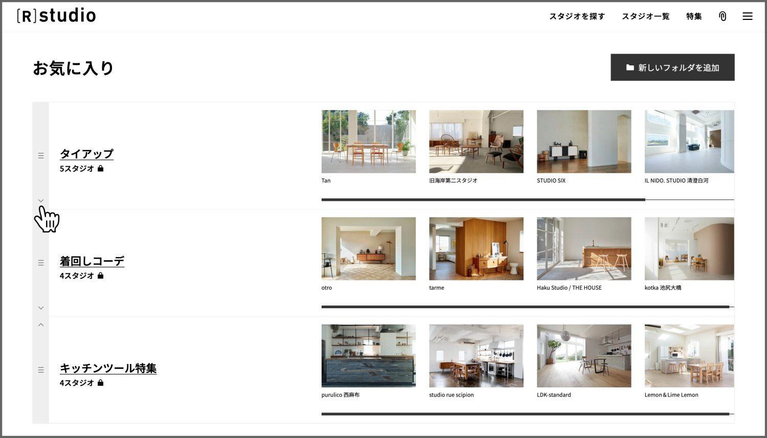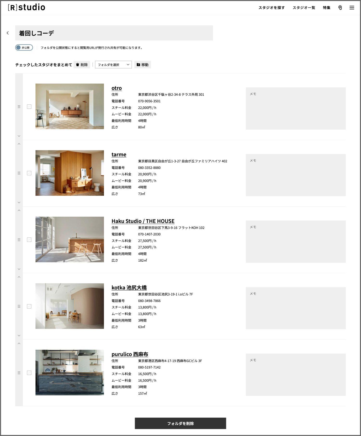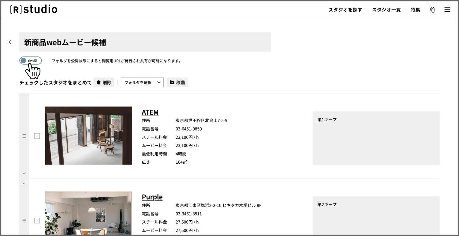気になったスタジオを撮影案件ごとにフォルダで管理でき、仕事仲間に共有も可能です。