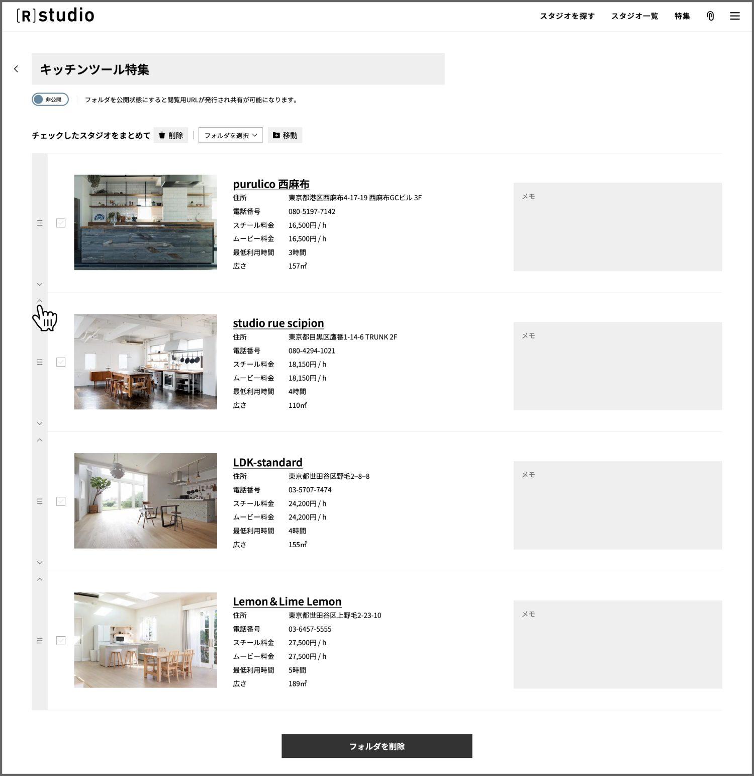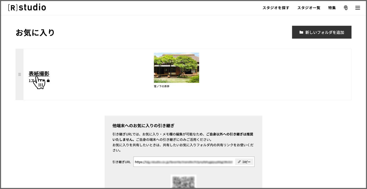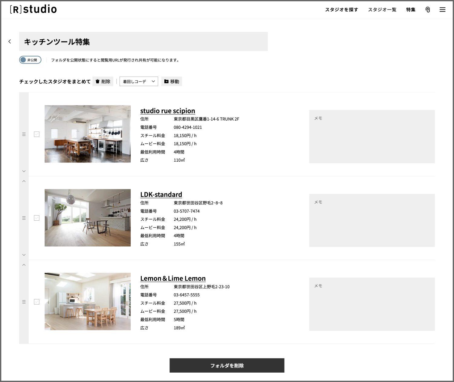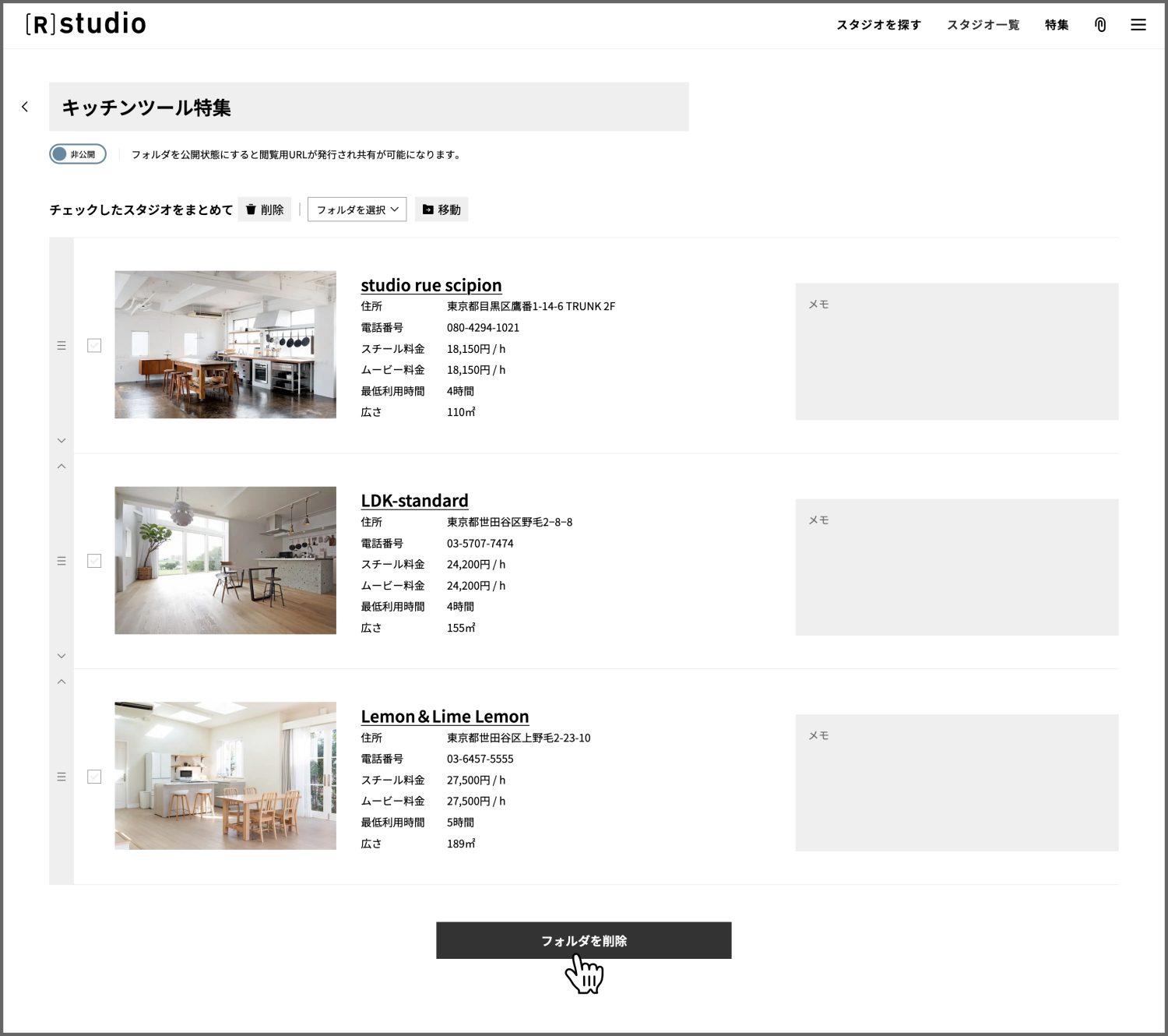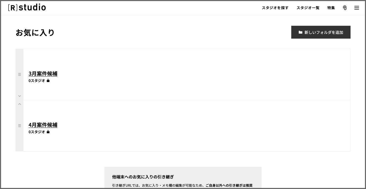 共有された相手は、そのお気に入りフォルダにスタジオを追加・削除したり、メモを追加したりなどの編集はできず、閲覧のみが可能。