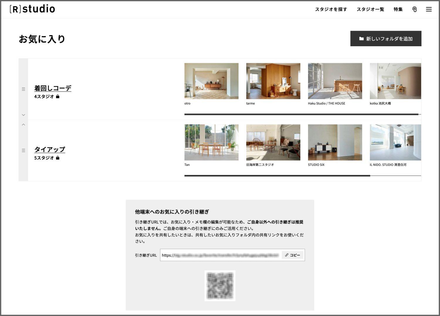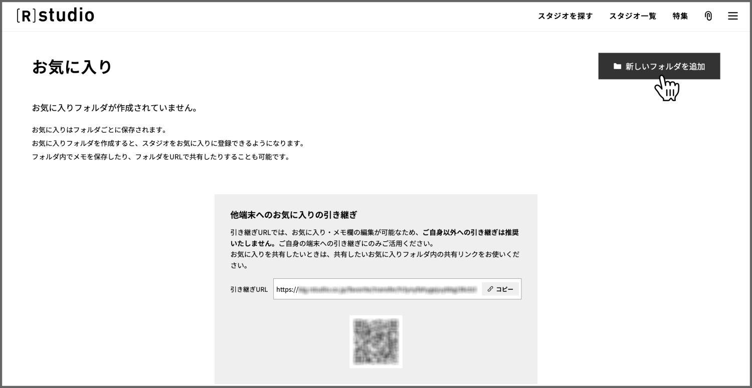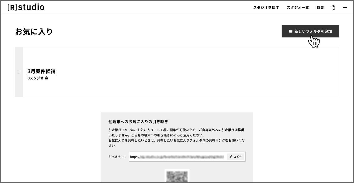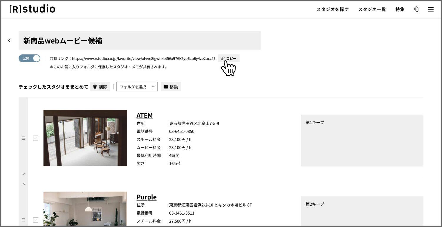 ひとつずつスタジオURLを記載しなくても、共有したいスタジオをお気に入りフォルダに登録し、共有URLを送れば、簡単にスタジオを共有できます。