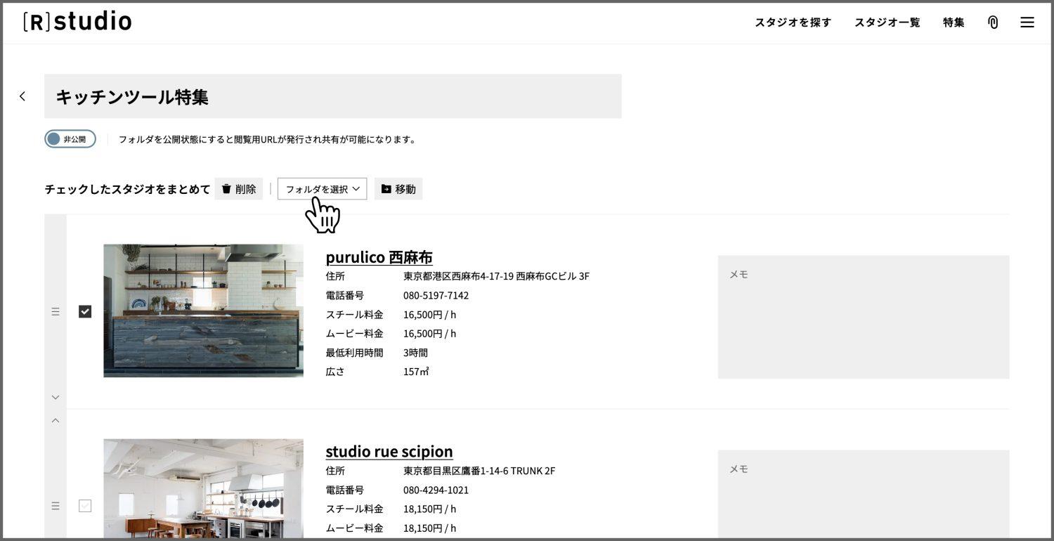 ③スタジオ一覧や検索結果スタジオ表示などから各スタジオ写真左上の「クリップマーク」をクリックする。作成したフォルダが表示されるので、追加したいフォルダをクリックする。