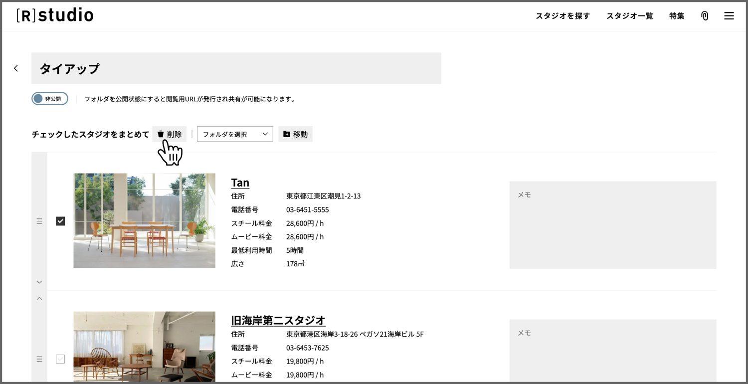 ①お気に入りフォルダ内で、削除したいスタジオにチェックをつける。上部の「削除」をクリックする。