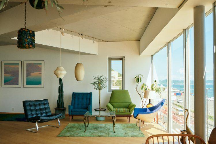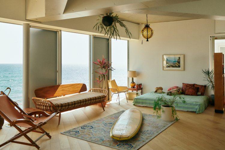 アメリカで買い付けられたミッドセンチュリー期の家具と海抜けの組み合わせが抜群!日没前には七里ヶ浜の夕日が室内を照らし、昼とは異なる雰囲気を味わうことができます。キッチンや開放的なルーフトップも備えており、ゆったりとした時間が流れる生活のシーンも撮れそうです。